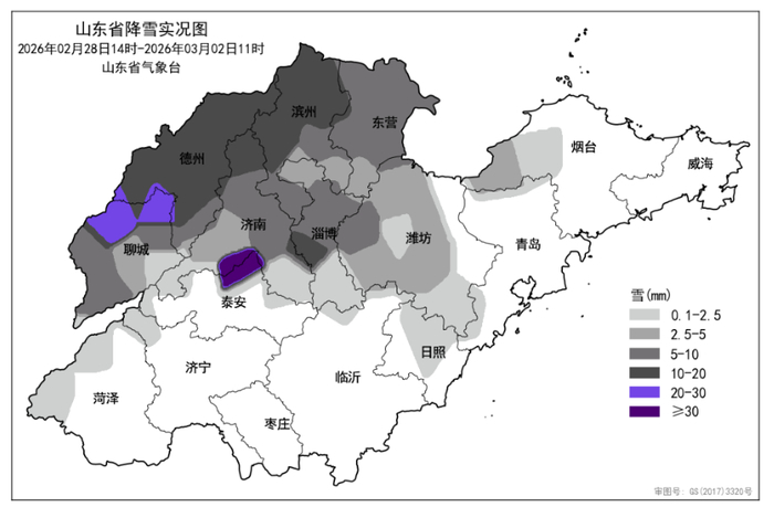 2月28日14时至3月2日11时,全省共有12市、60县(市、区)出现降雪,平均降雪量4.3(毫米,下同)。各市平均:德州14.6、聊城10.4、滨州10.0、泰安8.0、东营6.6、淄博6.5、济南5.9、潍坊3.1、烟台0.5、日照0.4和菏泽0.3,其他市微量或无降雪。前3位的是:泰安泰山47.7、聊城临清28.5和聊城高唐21.0。