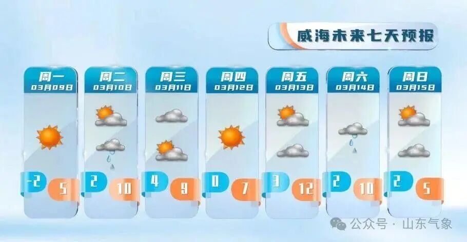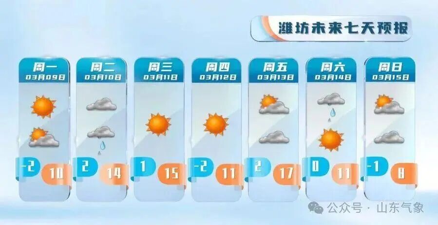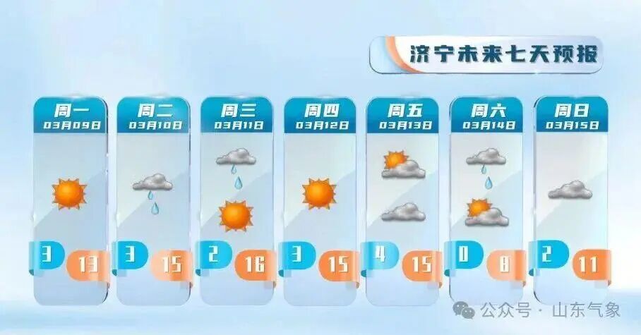 夜间最低气温:鲁西北地区-2℃左右,鲁南地区2℃左右,其他地区0℃左右。最高气温:沿海地区8℃左右,其他地区15℃左右。