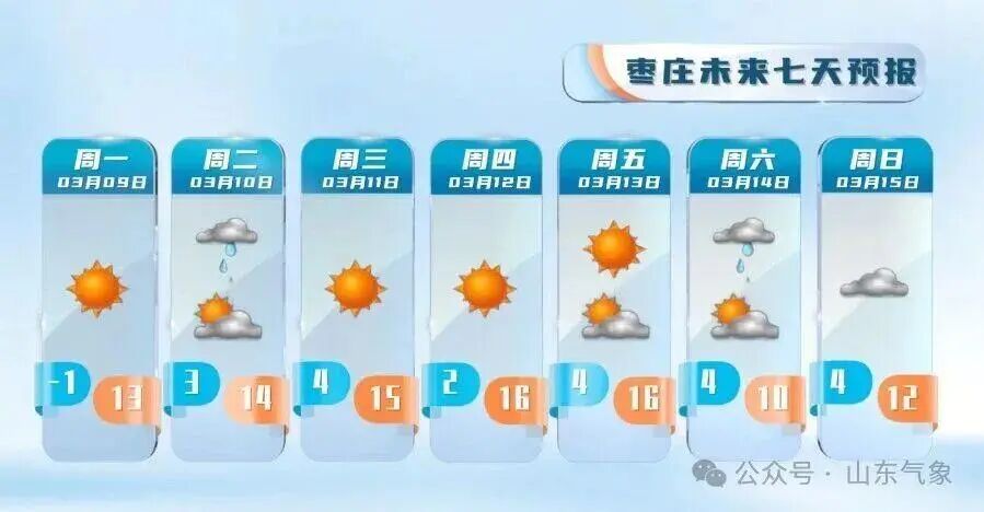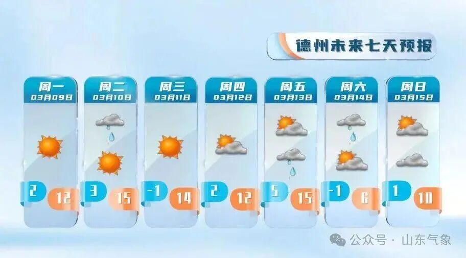 夜间最低气温:聊城、德州、菏泽、济宁和沿海地区3℃左右,半岛内陆地区-5℃左右,其他地区-1℃左右。最高气温:鲁南地区12℃左右,北部沿海地区6℃左右,其他地区10℃左右。