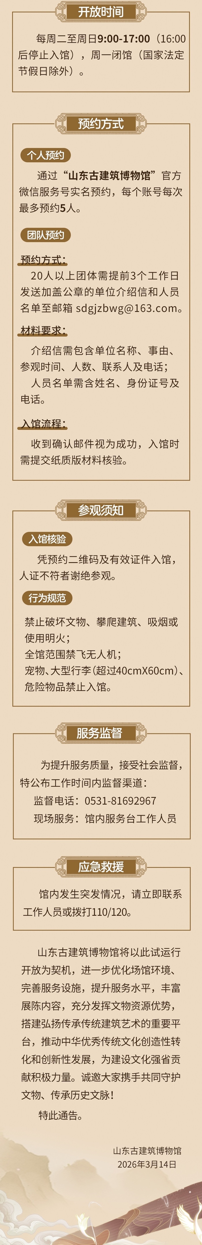 3月14日,新黄河记者从山东古建筑博物馆获悉,为促进文化遗产保护成果更多惠及广大人民群众,山东古建筑博物馆试运行期间(即日起—2027年2月17日)实行免费开放。