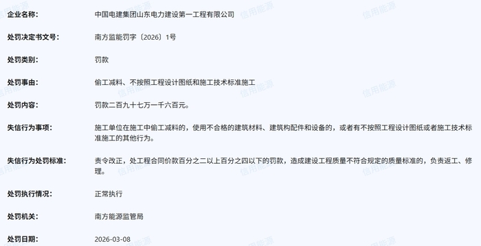 2026年3月8日,南方能源监管局出具南方监能罚字〔2026〕1号处罚决定,直指山东电建一公司存在偷工减料、不按照工程设计图纸和施工技术标准施工的严重违规行为,依据相关规定处以297.16万元罚款,这也是此次系列处罚中金额最高的一笔。