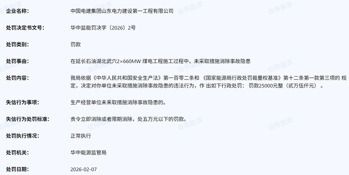 2026年2月7日,华中能源监管局下达华中监能罚决字〔2026〕2号处罚决定书,查明该公司在延长石油湖北武穴2×660MW煤电工程施工过程中,未采取措施消除事故隐患,依据《中华人民共和国安全生产法》第一百零二条与《国家能源局行政处罚裁量权基准》相关规定,对其罚款25000元。