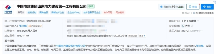 公开信息显示,中国电建集团山东电力建设第一工程有限公司是中国电力建设股份有限公司全资控股的专业化电力工程建设企业,是世界500强中国电建集团核心骨干企业,成立于1980年11月,注册资本16.08亿元,长期专注于电力工程建设相关业务。