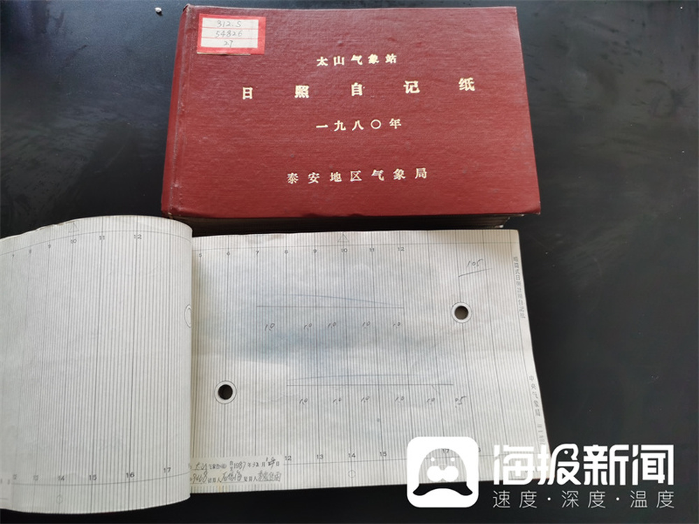 工作人员展示泰山气象站的部分历史观测数据。
