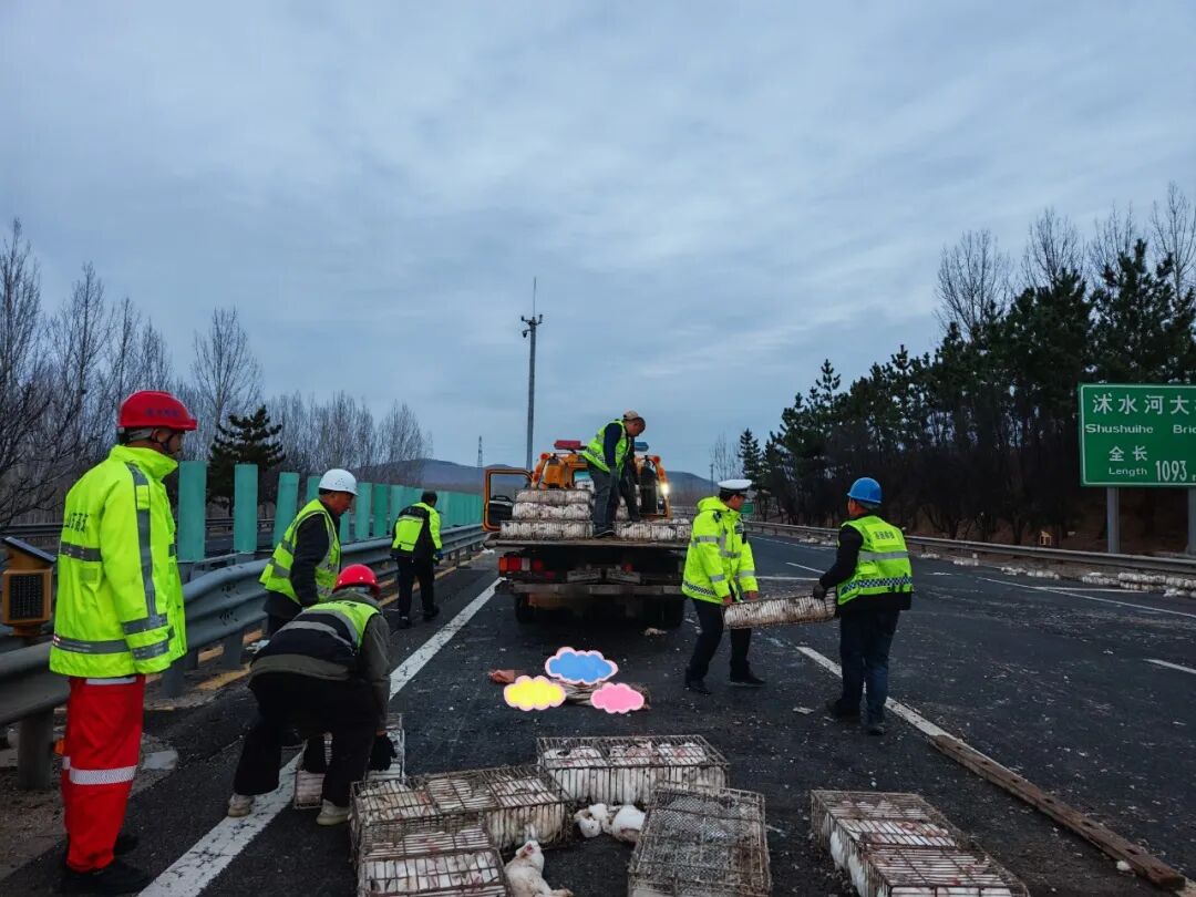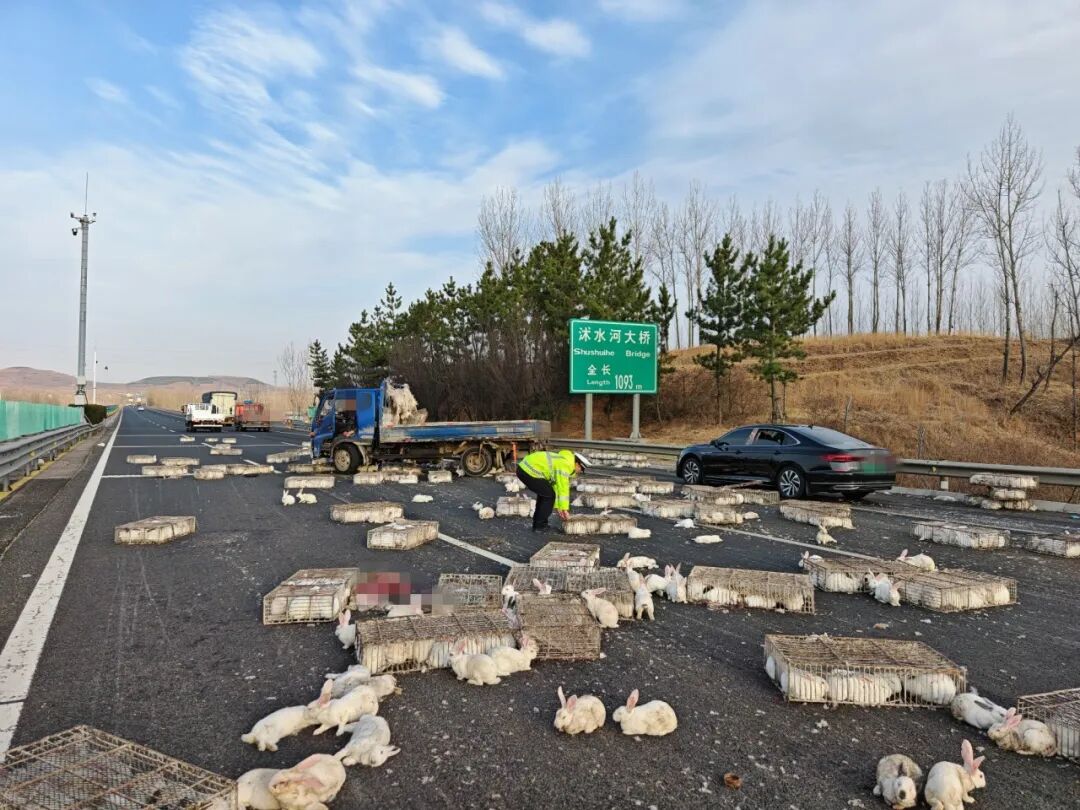 在民警与清障救援力量紧密配合下,现场快速完成清障工作,路面交通全面恢复正常。经了解,这辆货车运载着2000只兔子,共计110筐。