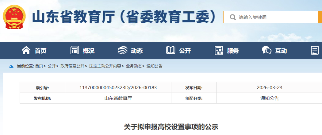 3月23日,山东省教育厅发布关于对拟申报高校设置事项的公示。公示显示,新建的“空天信息大学”为公办本科。