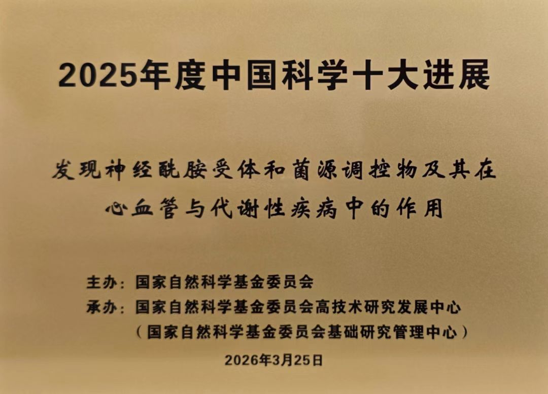 2026年3月25日,由国家自然科学基金委员会主办的2025年度“中国科学十大进展”评选结果发布。山东大学孙金鹏教授、于晓教授团队联合北京大学姜长涛教授、孔炜教授、乔杰院士、汪锴研究员等科学家团队,以及中日友好医院郑金刚教授团队、温州医科大学郑明华教授团队等合作完成的“发现神经酰胺受体和菌源调控物及其在心血管与代谢性疾病中的作用”入选其中。