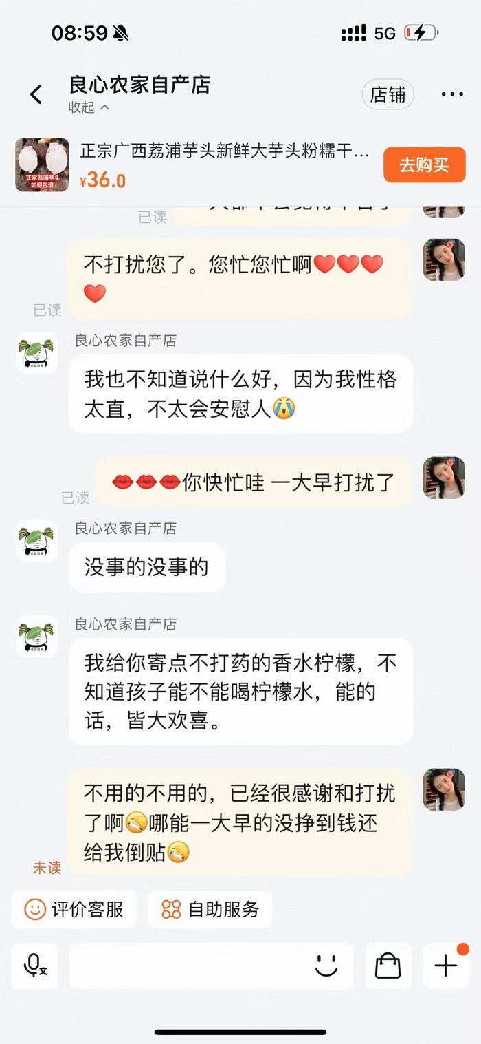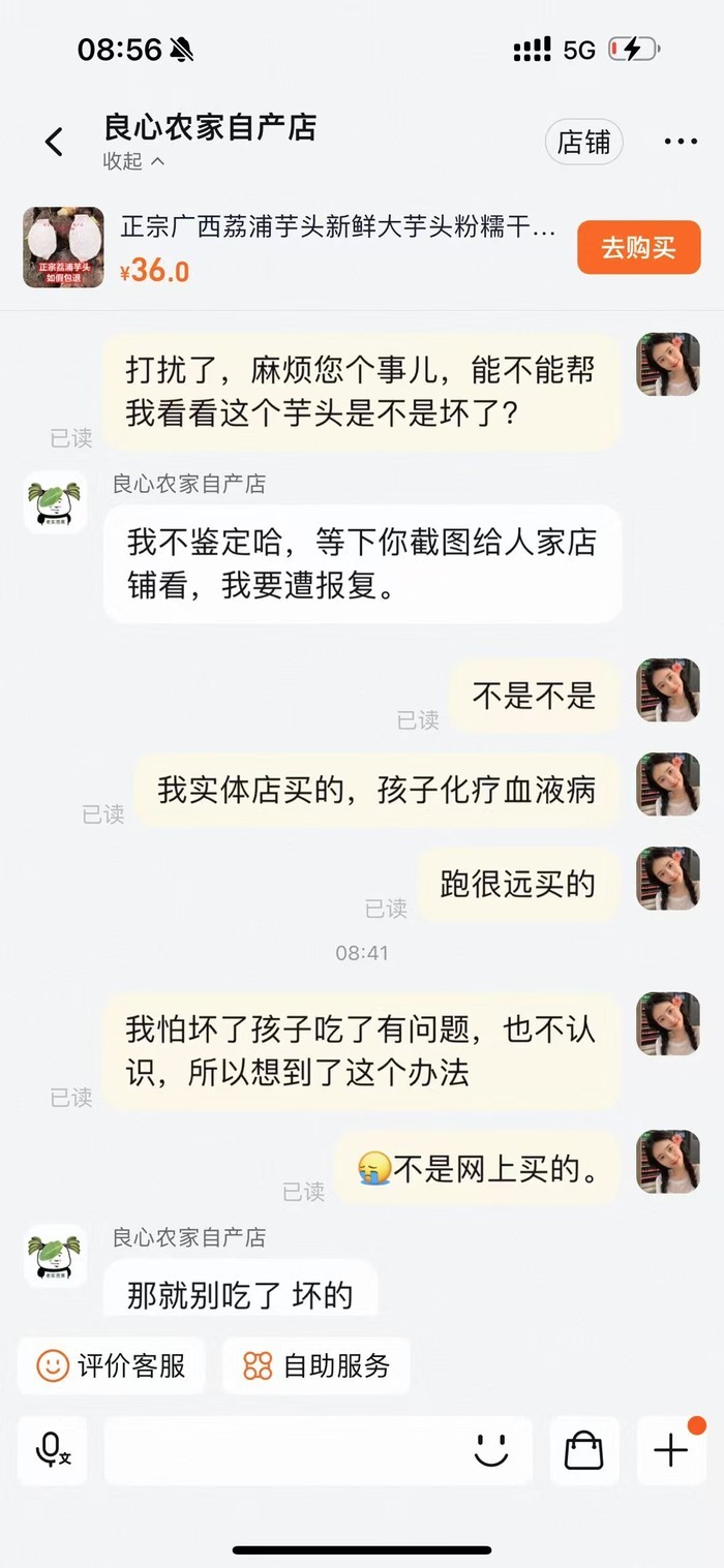 去不了市场,那就找一家网店帮忙看看。福宝妈妈这样想。随后,她打开手机淘宝,输入“荔浦芋头”后点击搜索,一个个商家瞬间出现在屏幕上。她随便找了一家名为“良心农家自产店”的店铺点进去,便开始了和店家的对话。“一开始店家以为我是从网上买的,害怕鉴定后被找麻烦,所以拒绝了。当我说明情况,她很热情地帮助了我。”她对当时的一幕记忆犹新,为了感谢店家的帮助,她特意在店铺内下单了木瓜,店家知道后,不仅退了款,还免费邮寄了一箱柠檬过来。