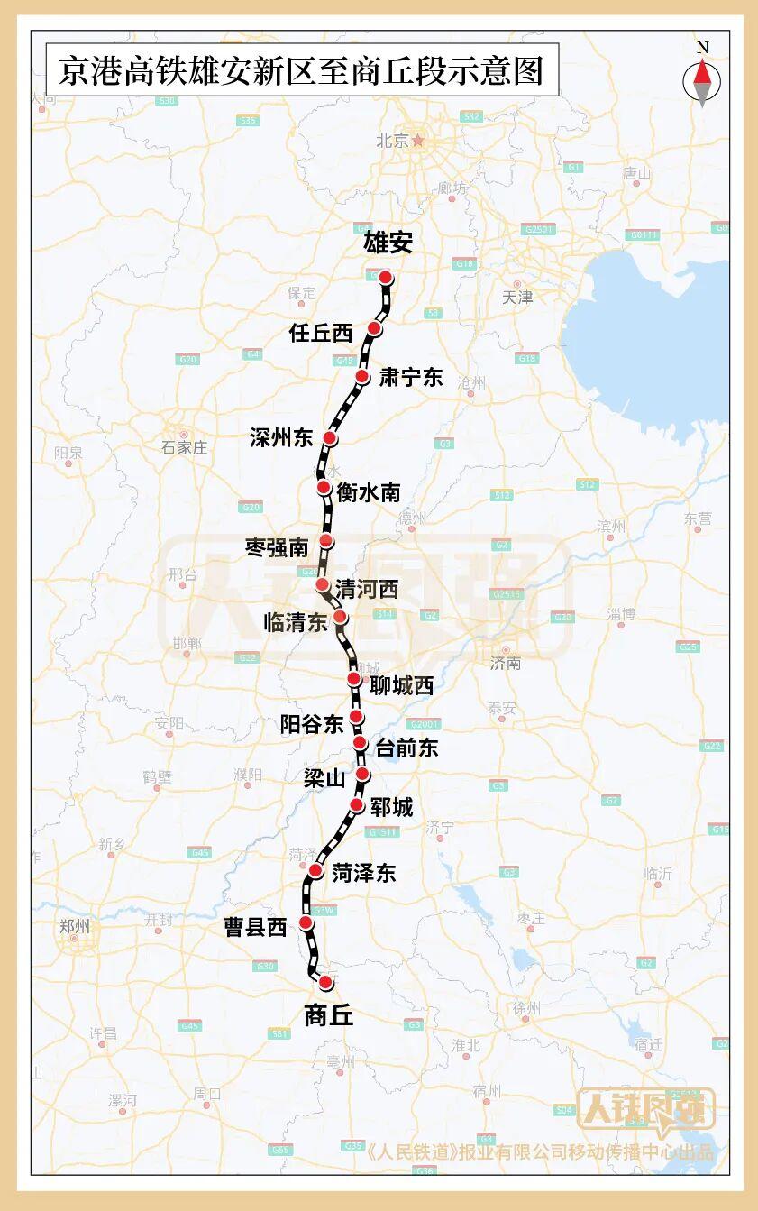 京港高铁雄安新区至商丘段北起京雄城际铁路雄安站,经河北省雄安新区、沧州市、衡水市、邢台市,山东省聊城市,河南省濮阳市,山东省济宁市、菏泽市至河南省商丘市,终至商合杭高铁商丘站。正线全长552公里,设计时速350公里。