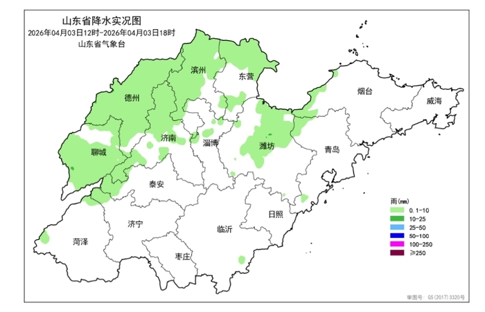 强对流天气赴约。据山东省气象台最新消息,4月3日12时至3日18时,全省共有13市、50县(市、区)、528乡镇出现降水,平均降水量0.6(毫米,下同),折合水量约0.9亿立方米。各市平均:德州2.2、聊城2.1和滨州1.1,其他市降水量不足1.0或无降水。