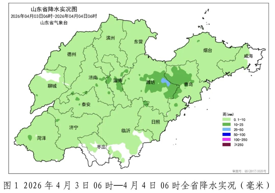 4月3日6时至4日6时,全省大部地区出现降水,平均降水量3.6(毫米,下同),折合水量约5.7亿方。各市平均:潍坊7.8、泰安5.8、青岛5.8、淄博5.5、济南4.4、烟台4.3、日照3.1、菏泽2.9、济宁2.9、滨州2.6、德州2.3、聊城2.2、东营1.8、临沂1.6,威海1.0 和枣庄0.3。县(市、区)平均降水量超过10.0的5个,5.0—10.0的25个,1.0—5.0的73个,前3位的是:潍坊高密14.2、青岛平度12.3 和潍坊安丘11.0。所有站点超过25.0的6个,10.0—25.0的117个,5.0—10.0的455个,降水量前3位的是:潍坊昌邑北孟32.0(气象站)、潍坊坊子辉村32.0(水文站)和潍坊坊子区涌泉28.0(水文站)。今年以来全省平均降水量42.9,较常年同期偏多5.8(16%)。