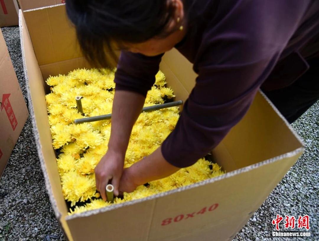 花农在大棚内将鲜菊打包、装箱。张敬伟 摄