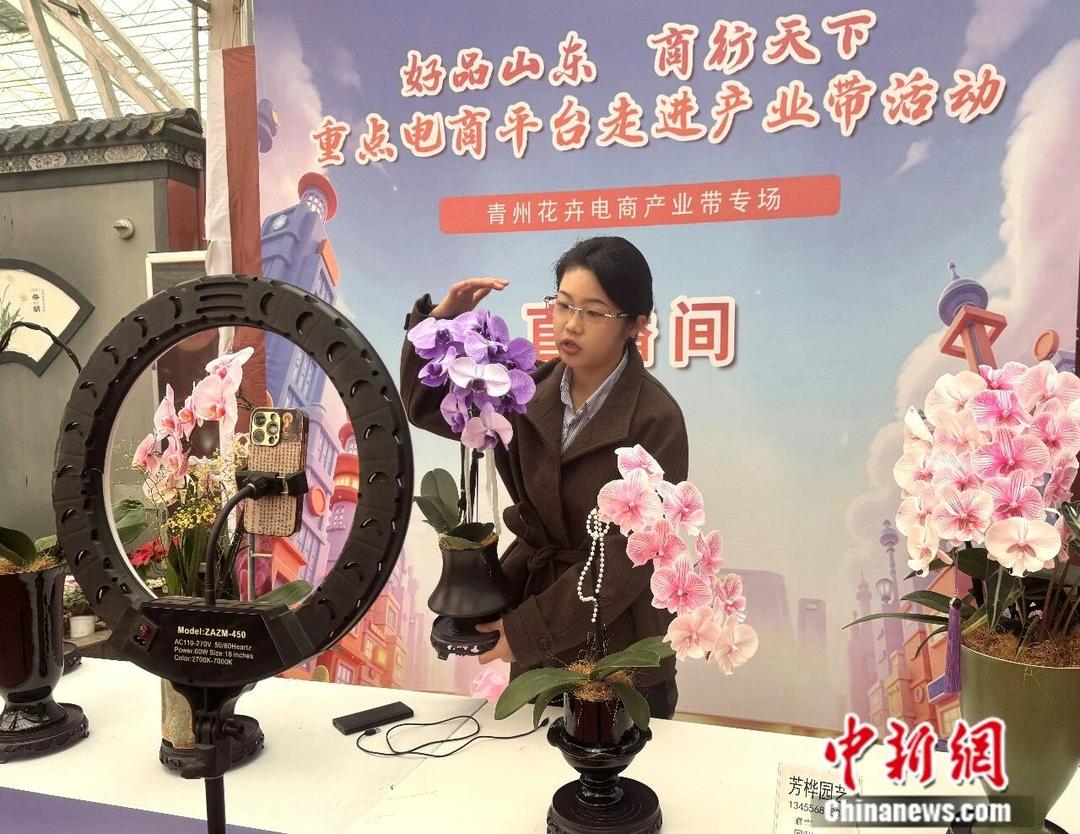 主播在直播间向各地网友介绍青州花卉的养护方法。(资料图)冯宁 摄