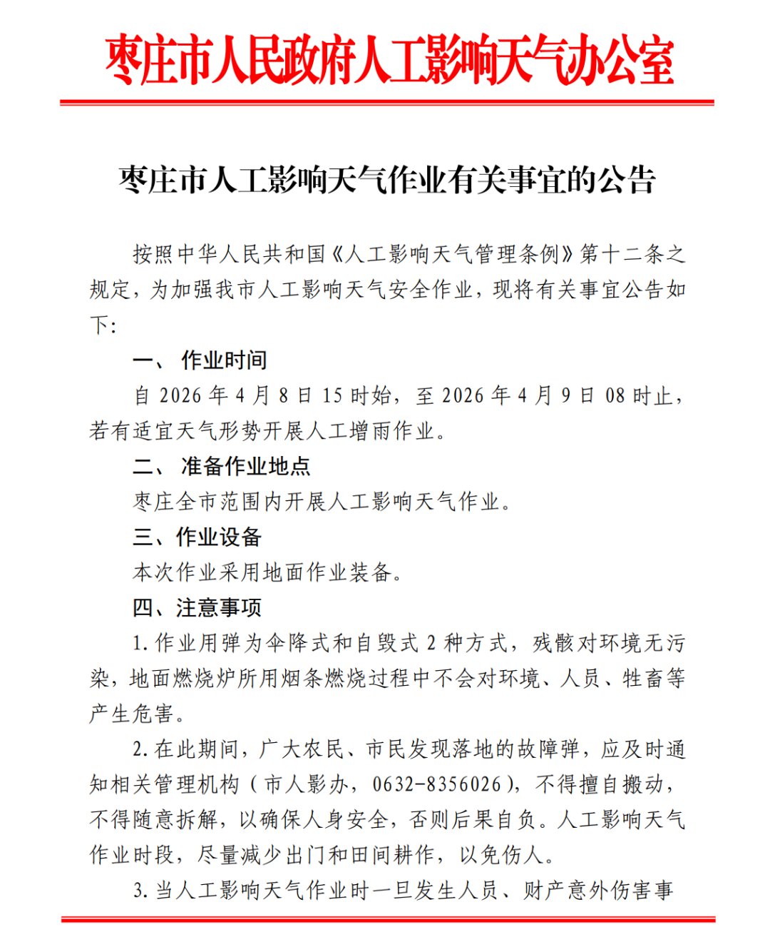枣庄市人工影响天气作业有关事宜的公告