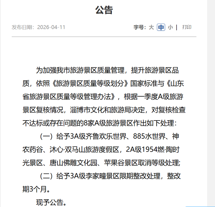 4月11日,淄博市文化和旅游局发布公告:根据一季度A级旅游景区复核情况,对复核检查不达标或存在问题的8家A级旅游景区作出取消等级和限期整改的处理。