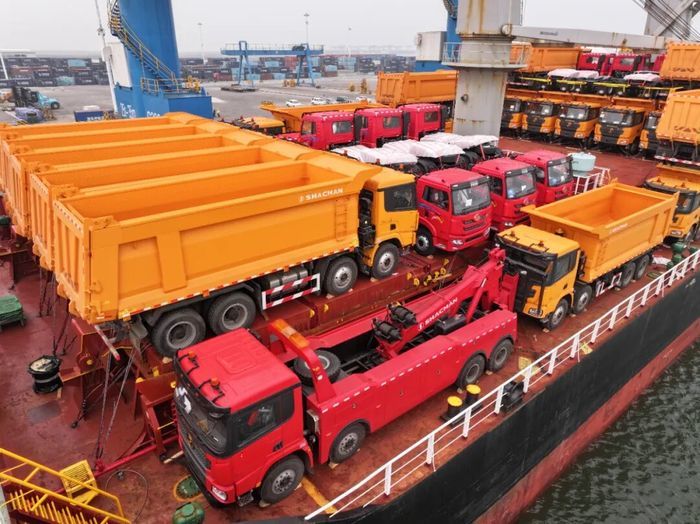 新黄河记者从山东省国资委了解到,近日,在山东港口渤海湾港潍坊港区,“潍坊—印尼”航线首批超百辆国产大型工程车完成全部装船作业,启航奔赴印尼,创下该航线开通以来单次车辆出口数量新高。