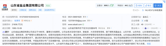 根据企查查平台信息显示,山东盐业成立于1990年10月,注册地位于济南市历下区,注册资本21608.70万元,法定代表人为钱秉军。公司经营范围广泛,许可项目涵盖食盐生产(分支机构经营)、食盐批发、食品销售、酒类经营、水产养殖等;一般项目包括进出口代理、汽车零配件批发零售、机械设备销售、技术服务、煤炭及制品销售、化肥销售、海水淡化处理、风力发电技术服务等多个领域。