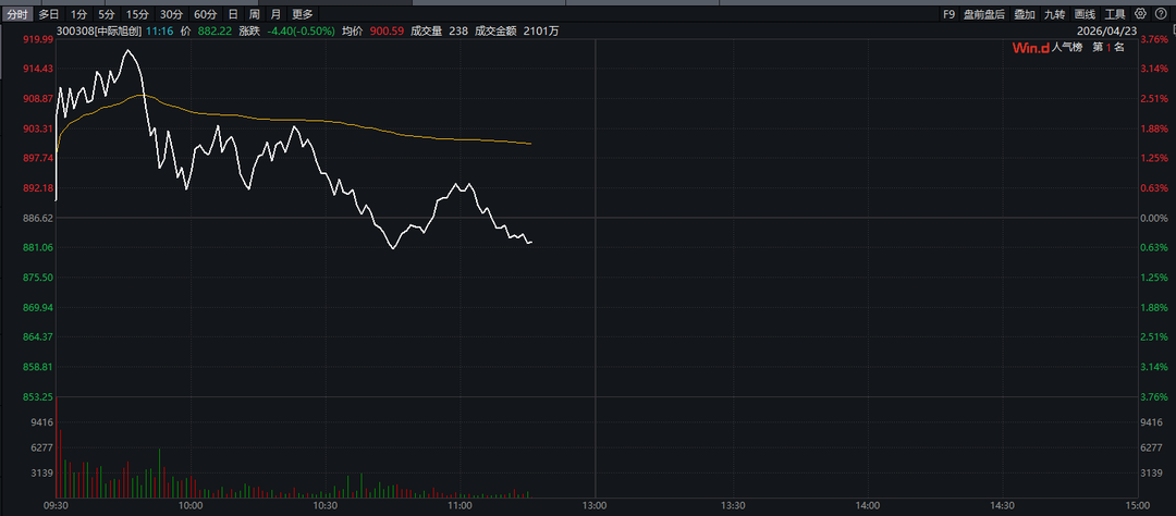 截至11点16分,中际旭创股价稍有回落,股价报882.22元/股,较前一交易日下跌0.5%。