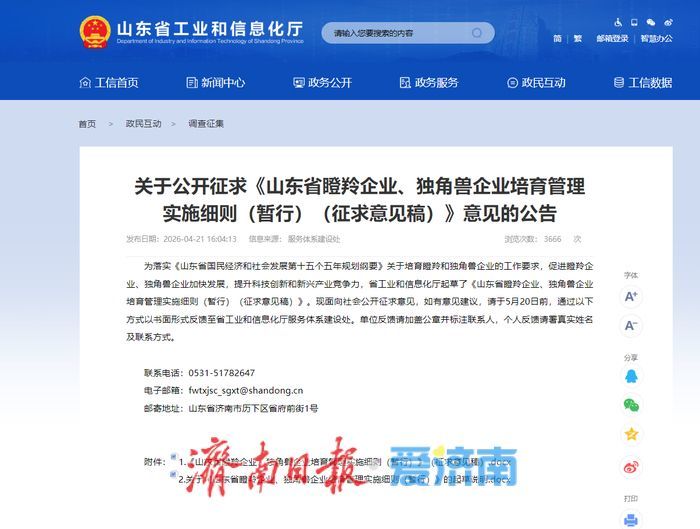 4月21日,山东省工业和信息化厅发布公告,就《山东省瞪羚企业、独角兽企业培育管理实施细则(暂行)(征求意见稿)》面向社会公开征求意见,意见反馈截止日期为5月20日。