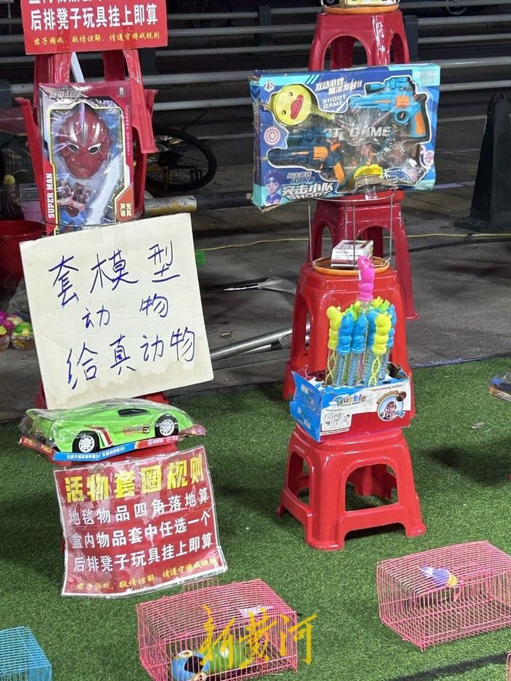 在套圈营业场地,一张醒目的牌子立在小摊前,标注着“套模型动物送真动物”。记者看到,商家已在街区一侧摆出套圈游戏道具,地面上摆着8排奖品,其中有3排是“动物”套圈区,每个笼子里都有一类奖品,关着的铁笼子里,有代替的动物模型,但也有真动物混在其中。