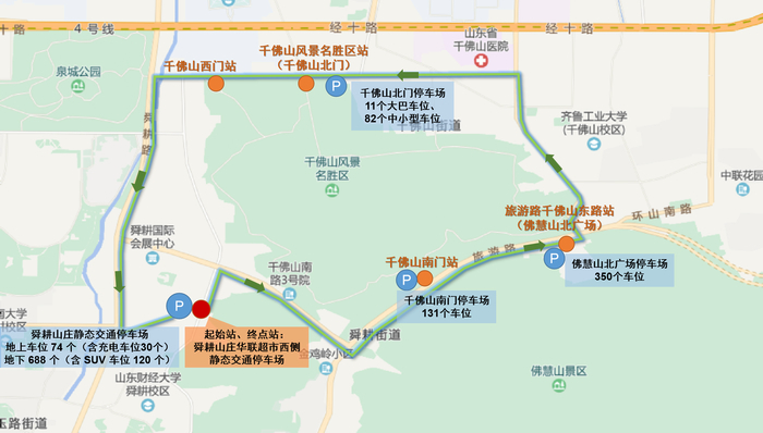 三、专线站点周边停车场:有4处,分别为舜耕山庄静态交通停车场(地上车位74个,含30个充电车位;地下车位668个,含120个SUV车位)、千佛山南门停车场(131个车位)、佛慧山北广场停车场(350个车位)、千佛山北门停车场(11个大巴车位、82个中小型车位)。广大市民游客可自行选择停车区域,换乘专线、就近入园。