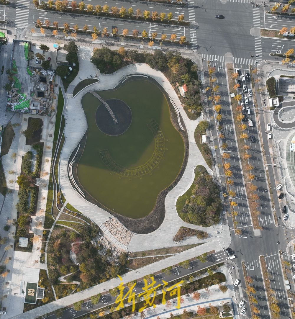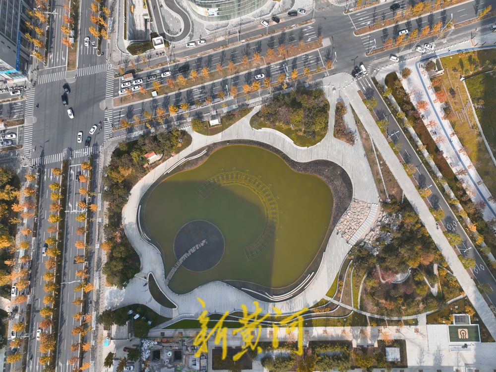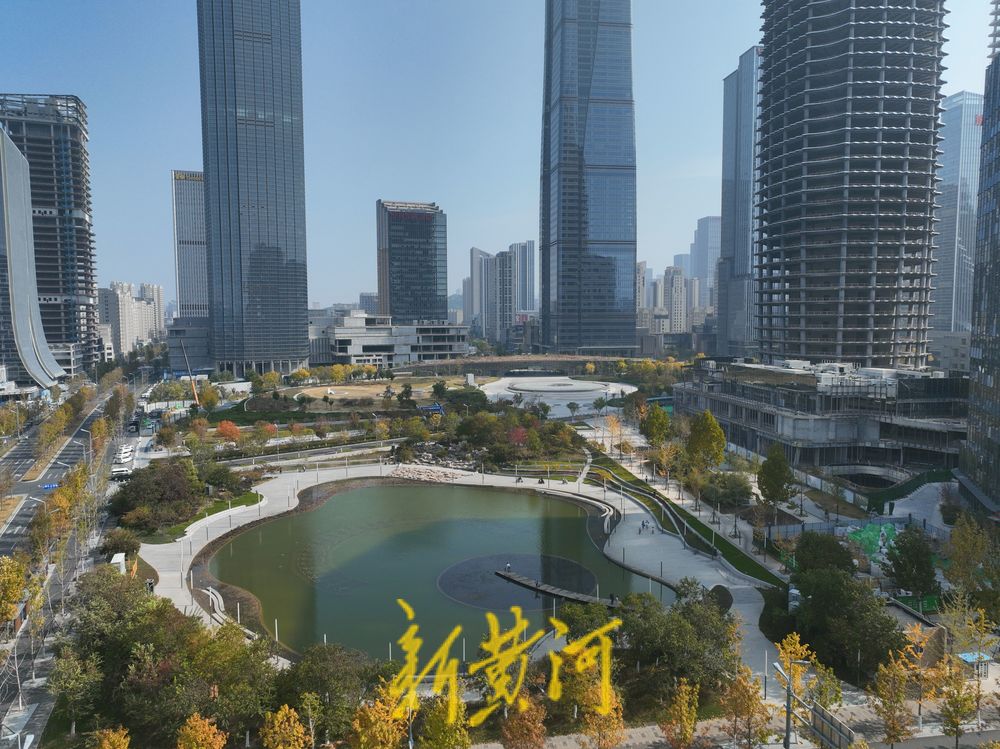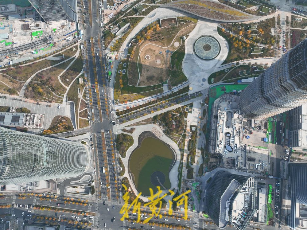 11月3日,高空俯瞰济南中央商务区绸带公园核心片区的荷花湖,周边树木已渐次变黄,碧波荡漾的湖面与周边“五指山”超高层建筑相映成景,绘就出CBD深秋的画卷。