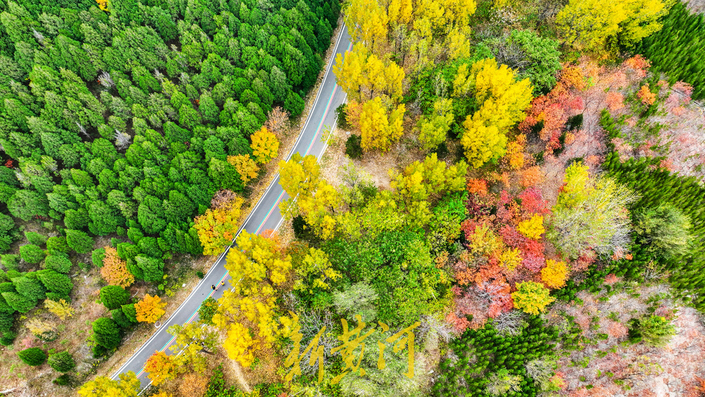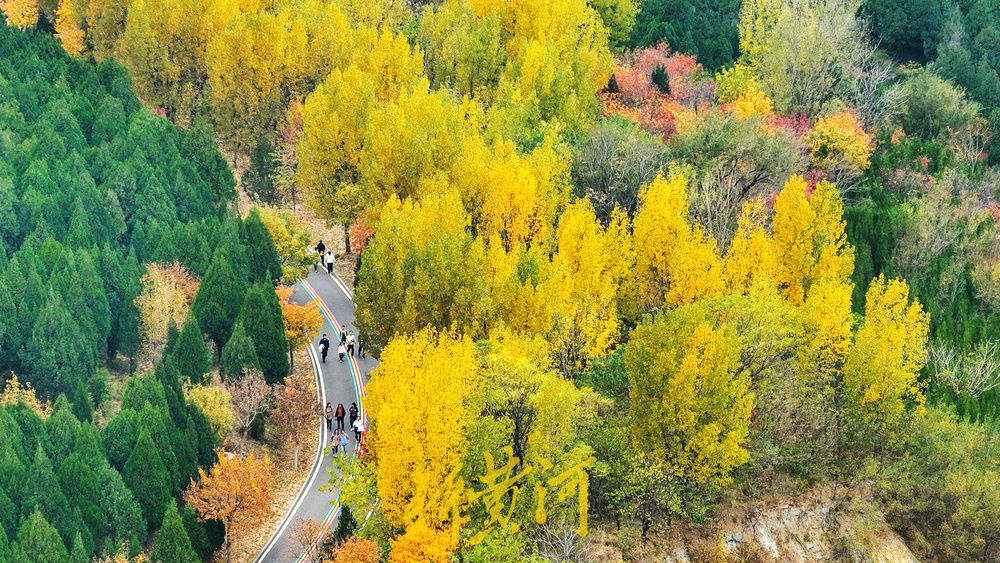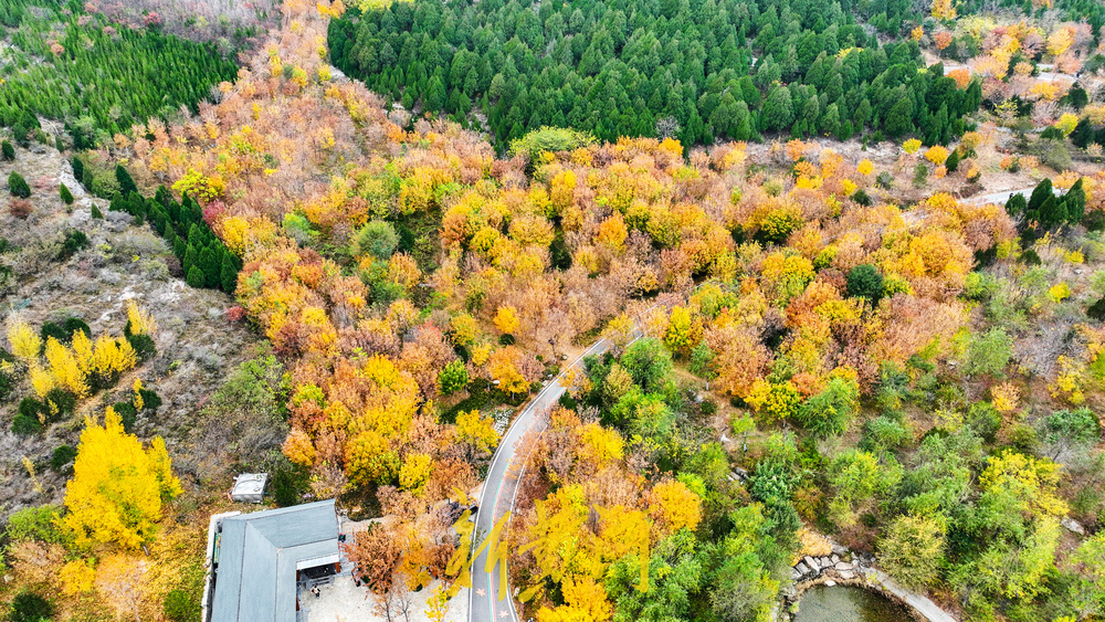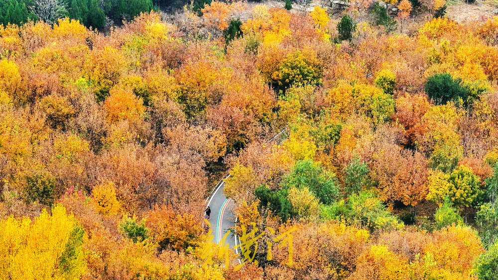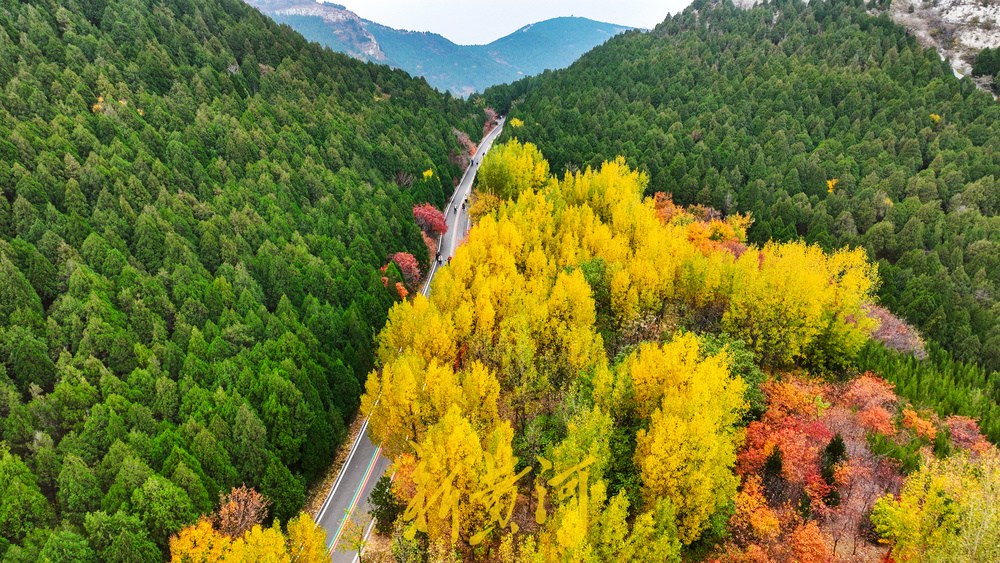 漫山遍野的黄栌树、杨树、白蜡树挂满红色或黄色的树叶,层次分明,又有松柏点缀其间,红黄绿相间秋意盎然。