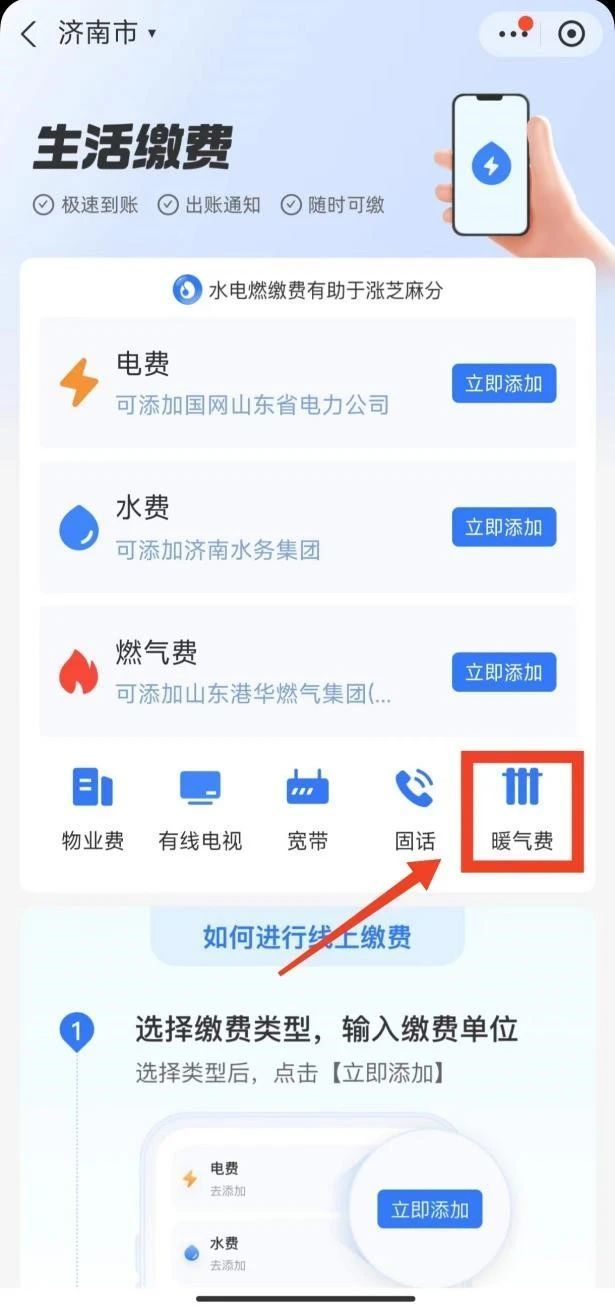 首页“更多”→便民生活→生活缴费→暖气费→济南东泰热力有限公司→按提示完成交费