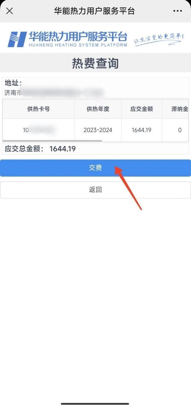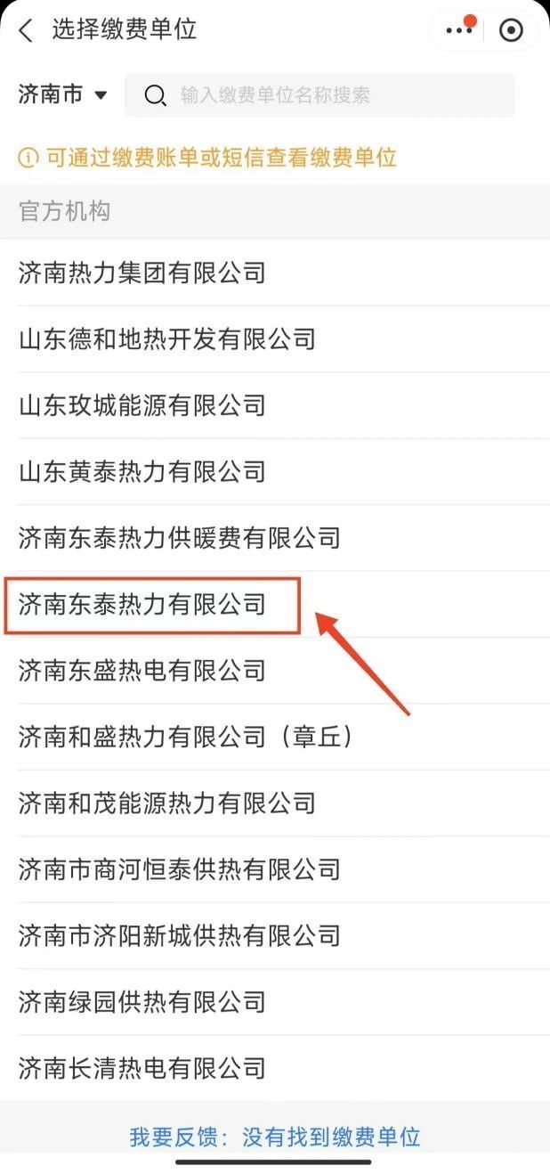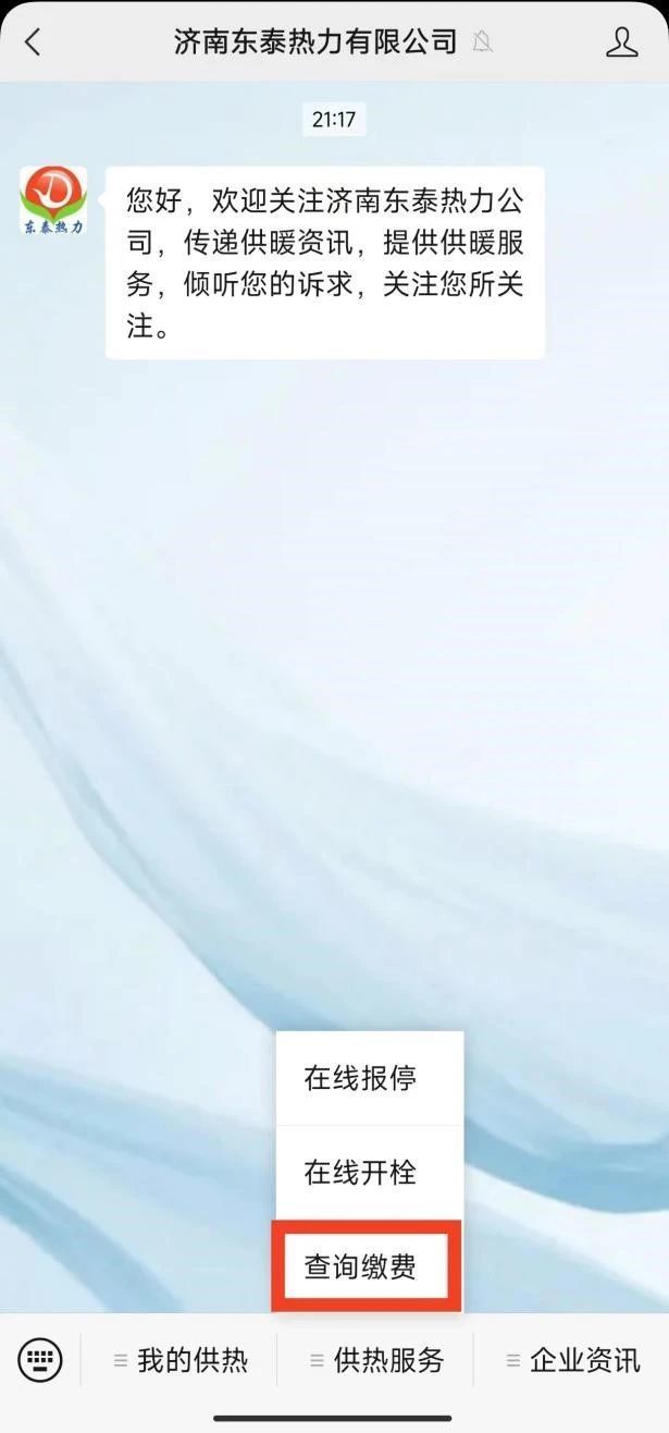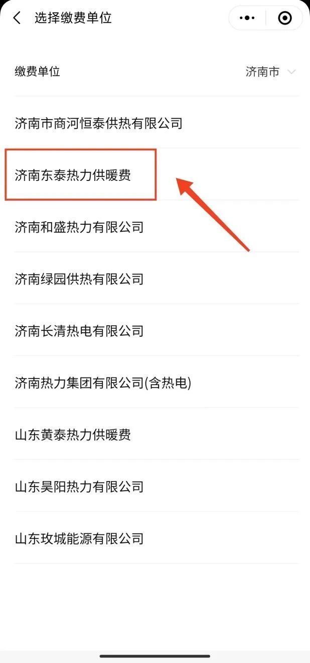 进入“济南东泰热力有限公司”微信公众号→供热服务→查询缴费→按提示完成交费