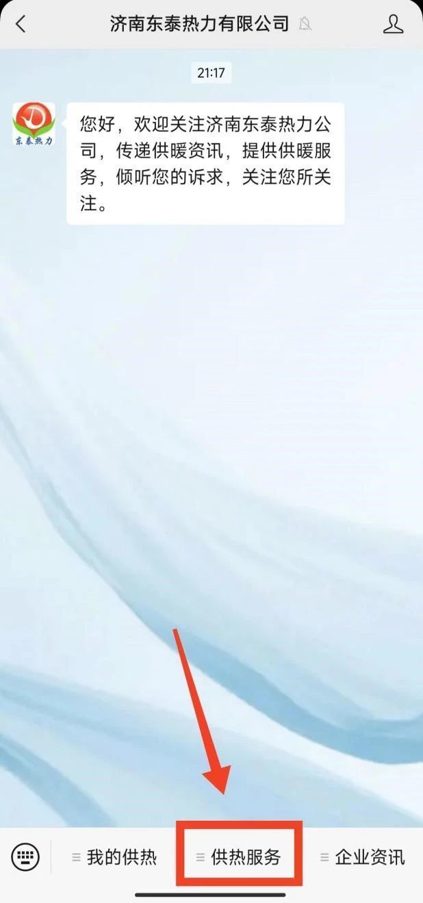 进入“济南东泰热力有限公司”微信公众号→我的供热→绑定卡号→输入卡号完成绑定