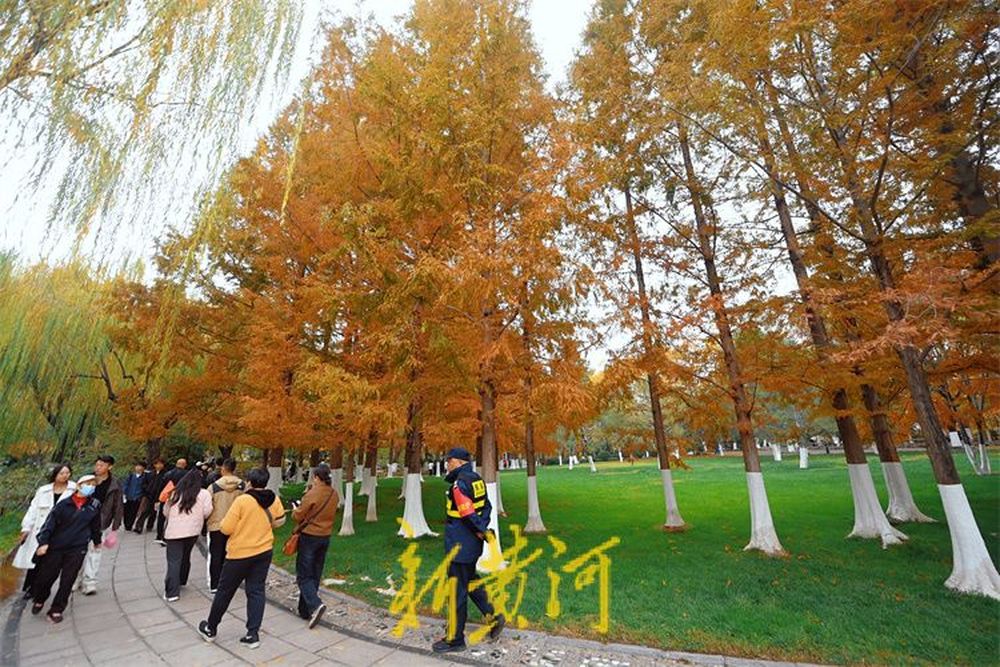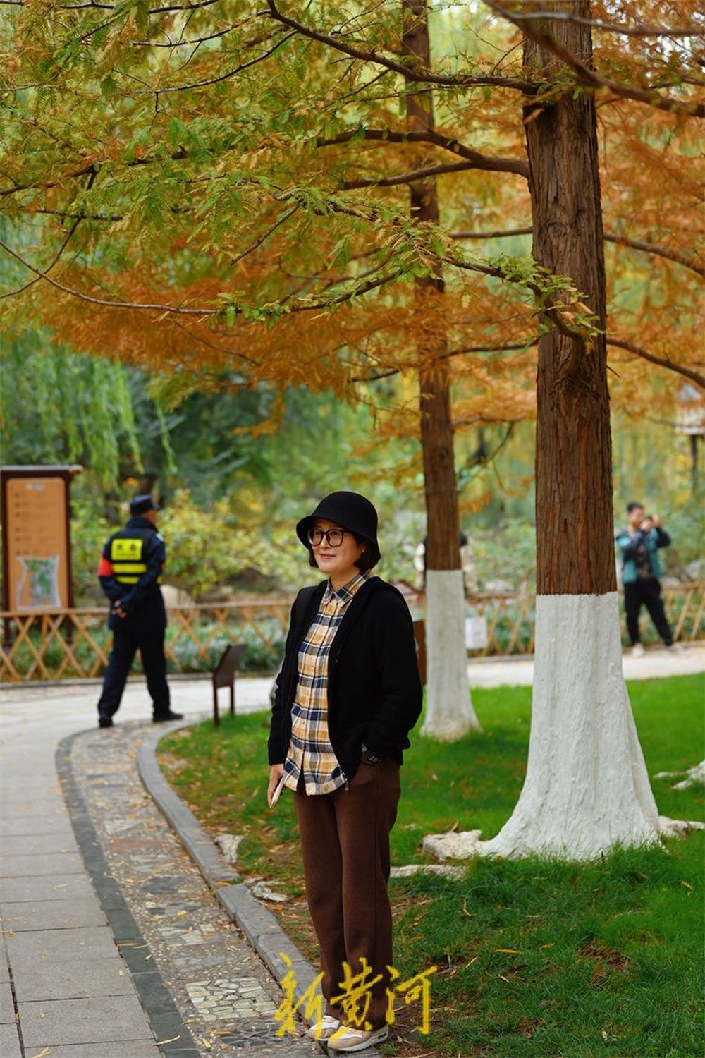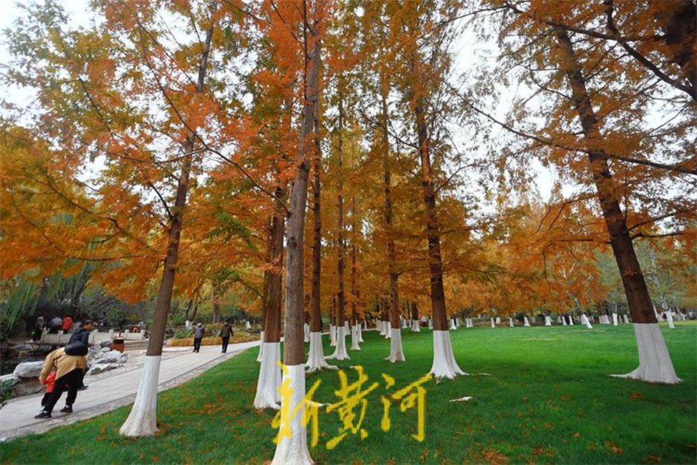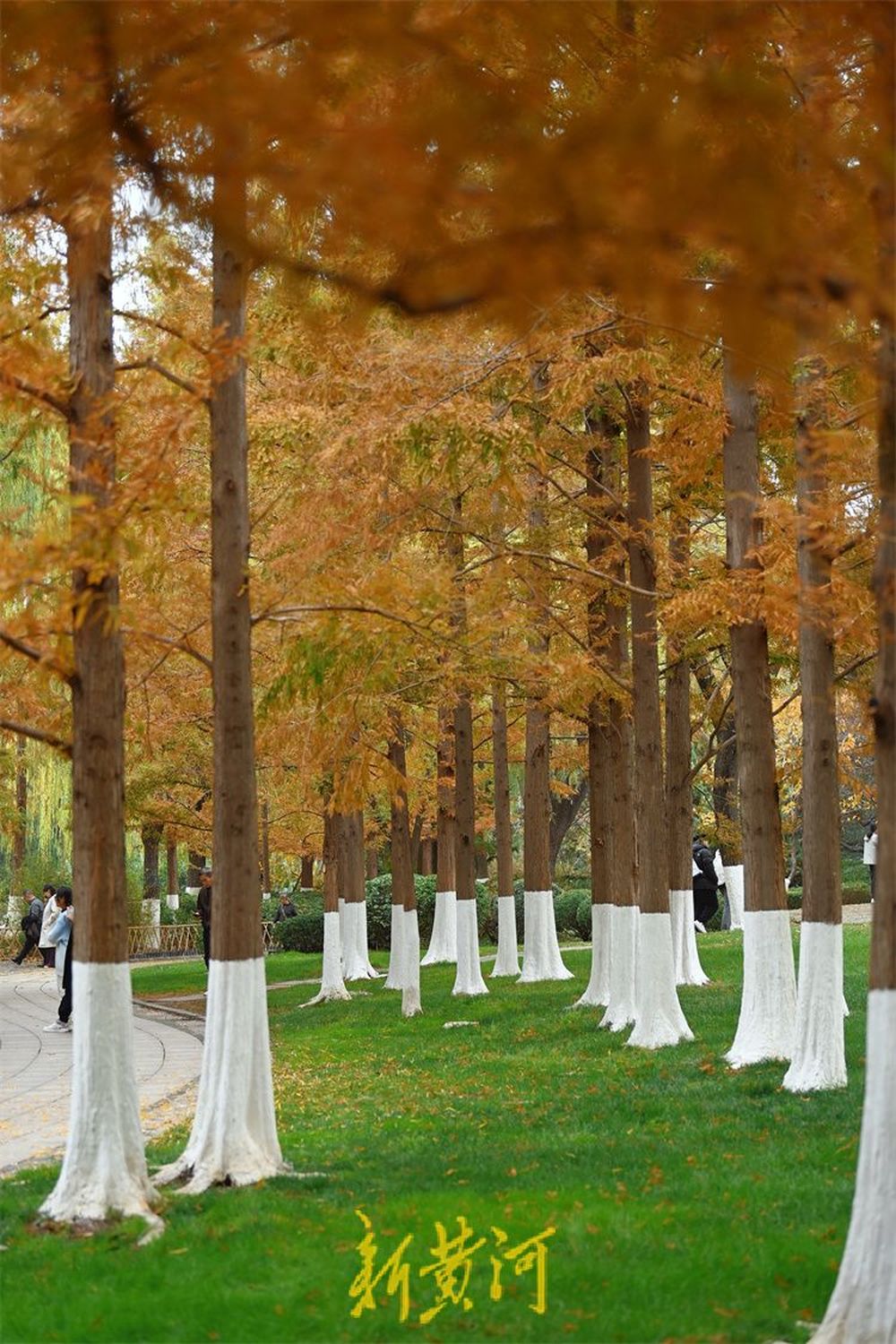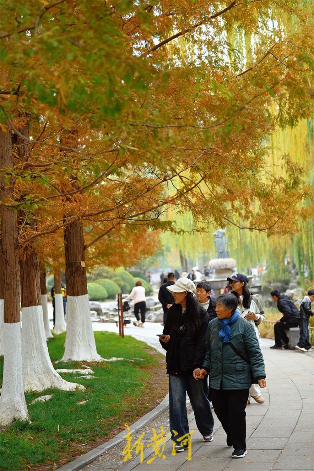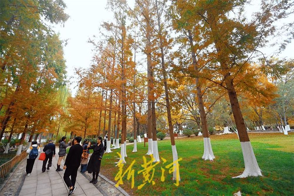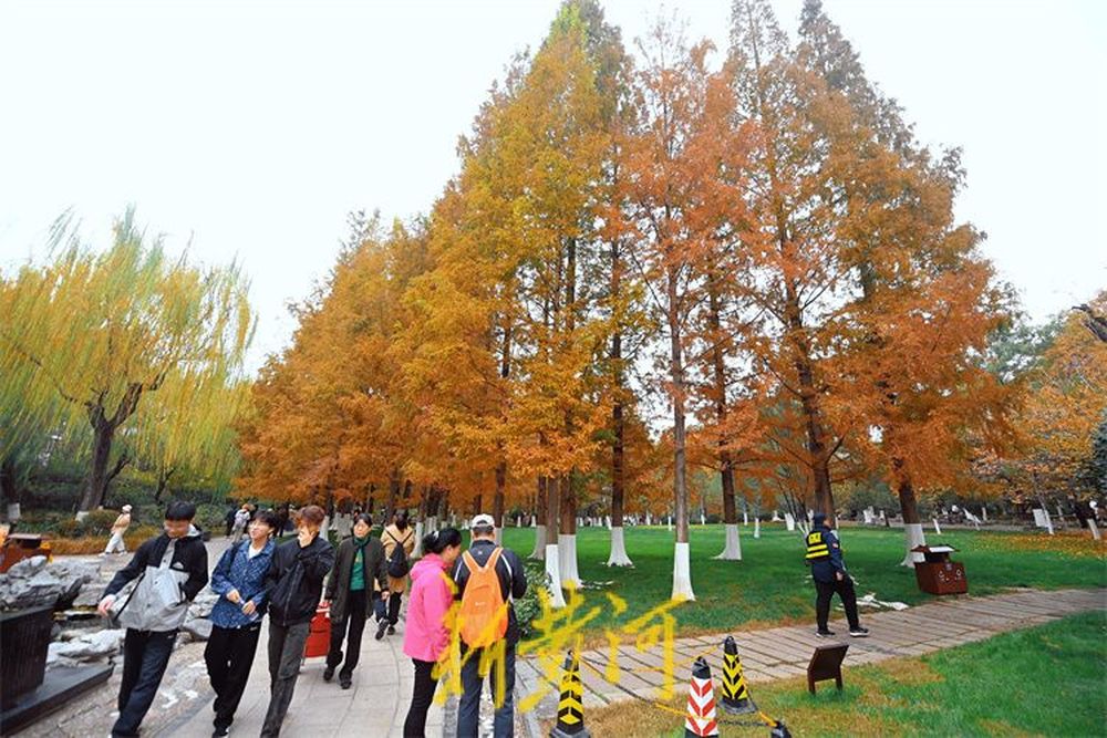 6日,济南五龙潭泉池北侧成片的水杉林渐红,入眼成画,迎来最佳观赏期,满树金黄且高大笔挺的树干直冲云天,吸引了众多游客打卡拍照。