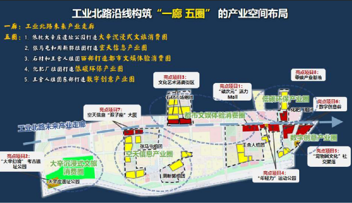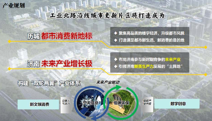 工业北路沿线片区项目拟将工业北路沿线打造为历城都市消费新地标、济南未来产业增长极,构建“双轮两翼”产业体系,形成新文娱消费、数字创意+汽车文化大产业集群,规划建设多元化产业载体及高品质住宅。沿线构筑“一廊五圈”产业空间布局,“一廊”即工业北路未来产业走廊,“五圈”为大辛沉浸式文旅消费圈、空天信息产业圈、都市文娱体验消费圈、低碳环保产业圈、数字创业产业圈。