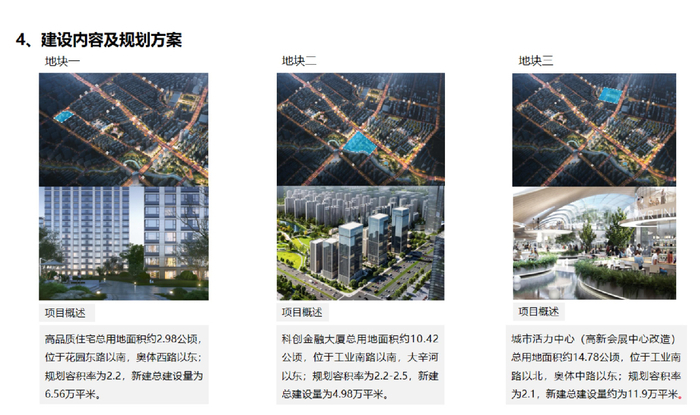在合作资源上,项目规划以会展中心及南广场改造提升、新建高端居住和商务办公为主。完成会展中心改造,总建筑面积约30万平方米,引入体育、电竞等业态。规划产业用地3公顷,总建面9万平方米,引入互联网、科技金融等产业。规划居住用地11.47公顷,总建面约26万平方米。