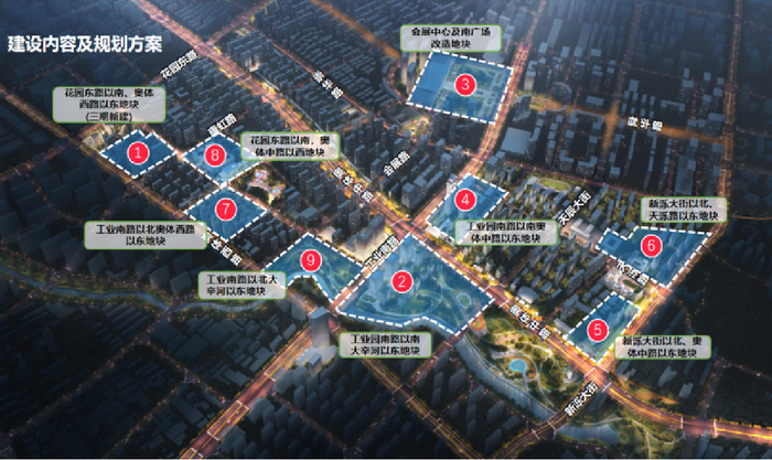齐鲁软件园西片区城市更新项目南至新泺大街、西至奥体西路,北至花园东路,东至舜华南路、会展东路,共有9个地块。项目用地311.24公顷,总建筑面积77万平方米。按照“留改拆”并举思路,对会展中心及南广场实施改造,拆除部分地块建设高品质住宅、数字产业大厦、科创金融大厦、体育商业综合体等。
