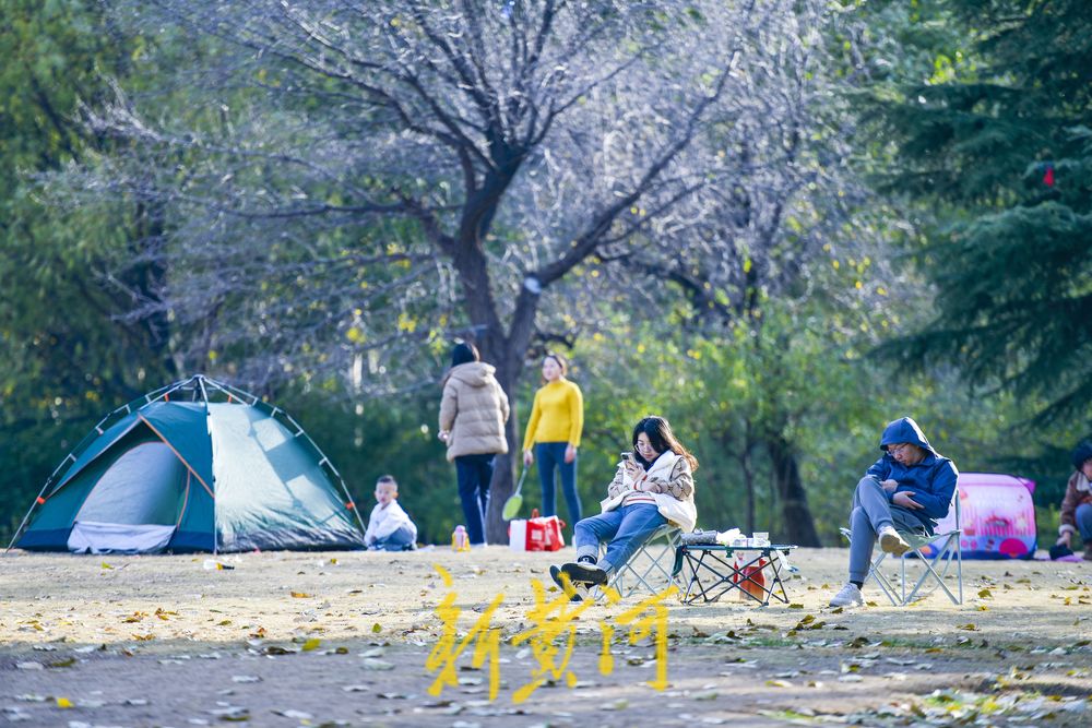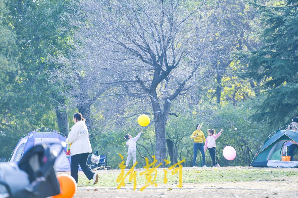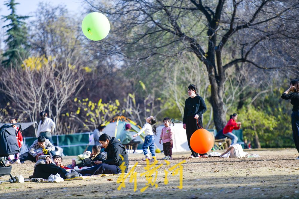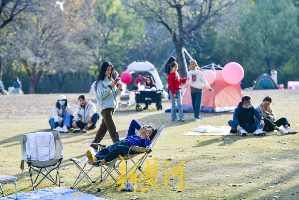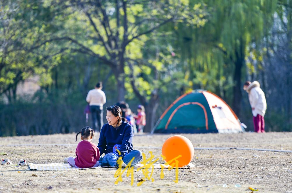 在二环西路东侧的森林公园大草地,这里是济南十大“最美共享绿地”之一,众多游客在草地上撑起帐篷、铺上垫子,在草地上休闲嬉戏,享受冬日暖阳。