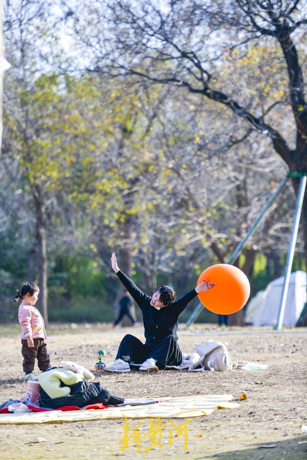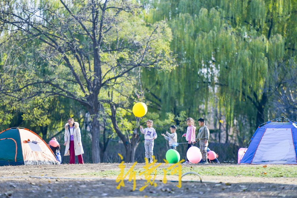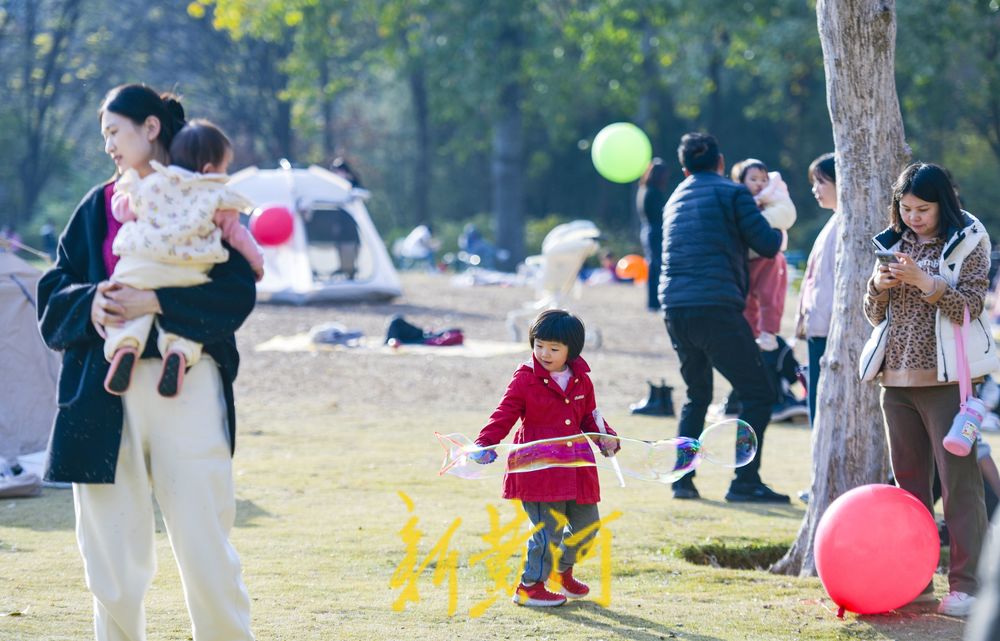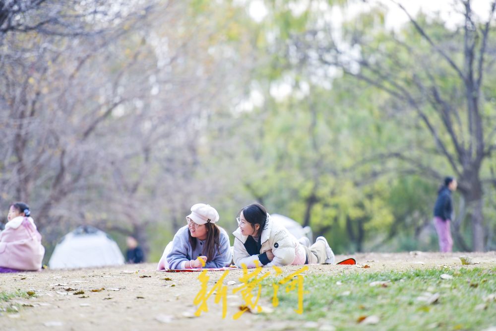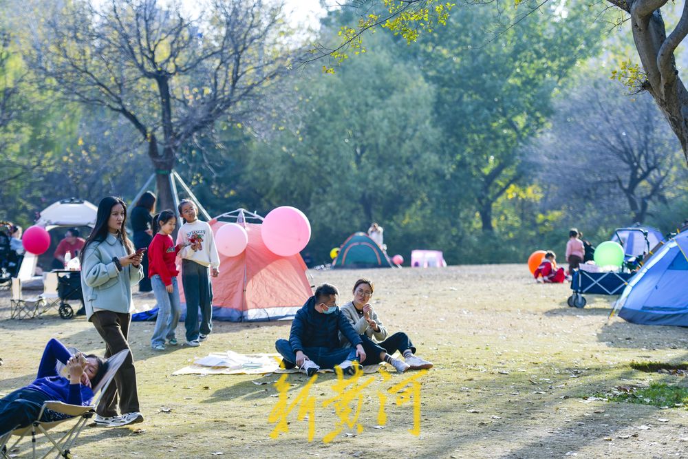 在二环西路东侧的森林公园大草地,这里是济南十大“最美共享绿地”之一,众多游客在草地上撑起帐篷、铺上垫子,在草地上休闲嬉戏,享受冬日暖阳。