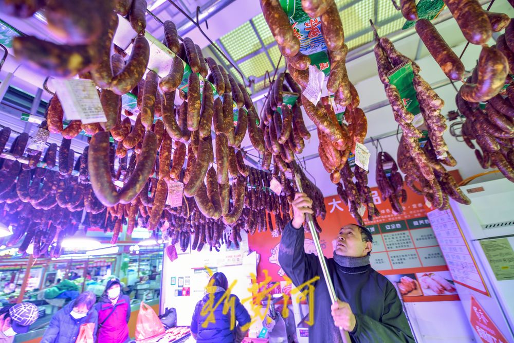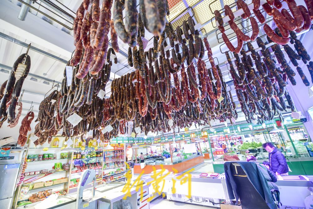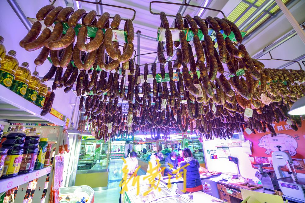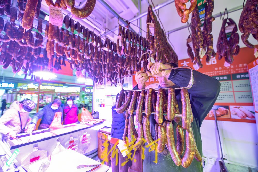 12月12日,在济南张庄路一家农贸市场内,多家生鲜肉销售店内都挂起了自制的香肠,一串串红白相间的香肠悬挂在晾晒绳上,一股浓浓的肉香味儿扑鼻而来。近期,济南猪肉价格平稳,不少市民在生鲜肉销售店购买了生猪肉后交予店家进行加工,切片、拌料、绞肉、灌肠、打孔、打结……在店主娴熟操作下,一根根香肠很快就加工完成,或是交给市民带回家中自行晾晒,或是由摊主免费帮忙风干晾晒。