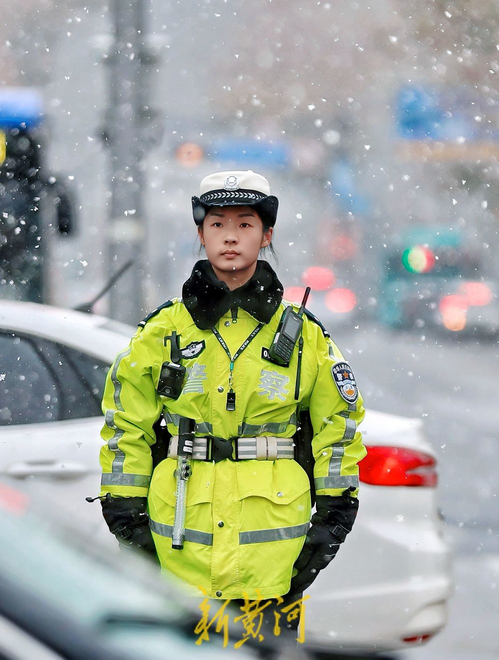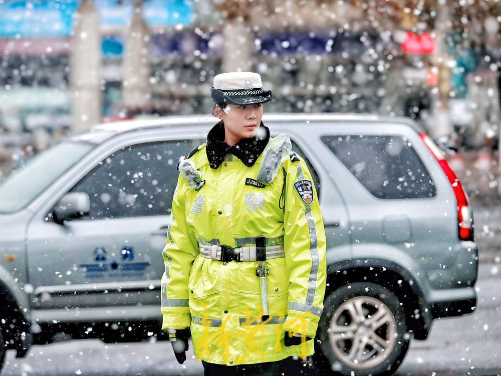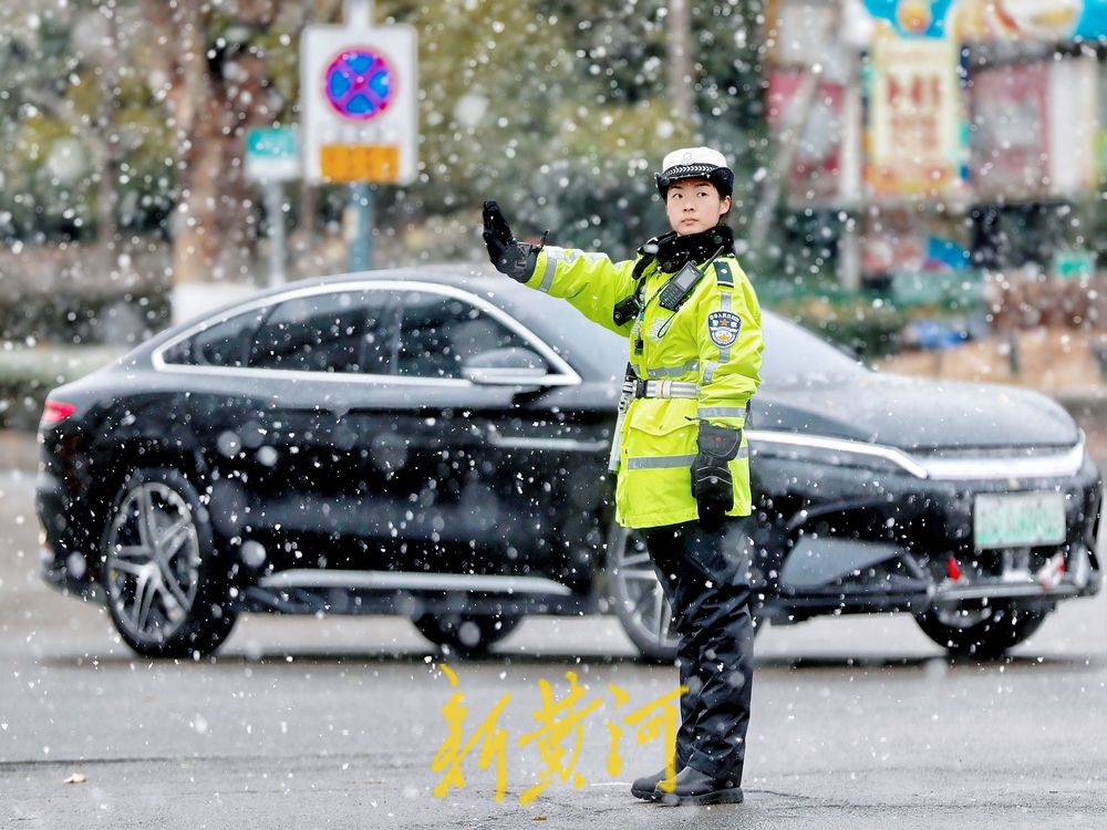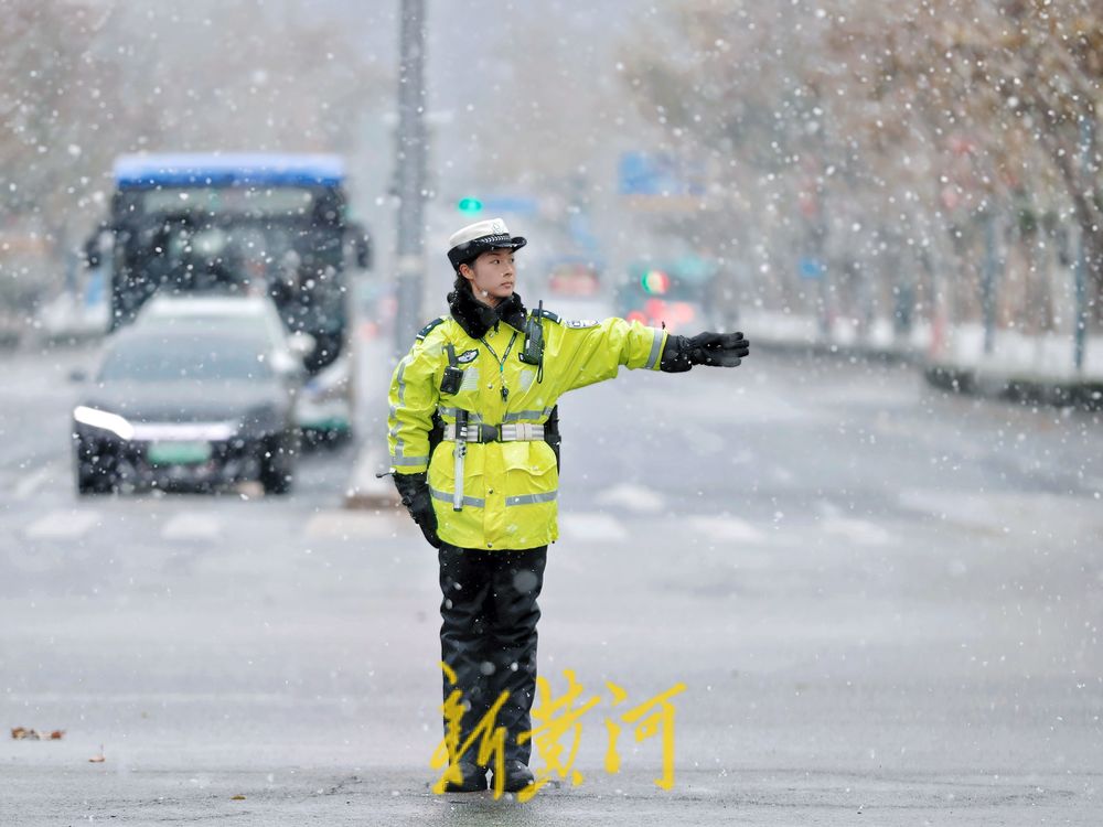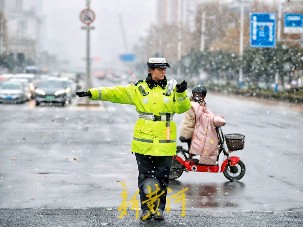 12月13日,泉城降下今冬初雪,在经十纬一路口,市中交警大队女子中队民警坚守岗位,指挥路口交通,风雪中,车辆跟随她们的手势有条不紊地行进,确保了道路畅通。