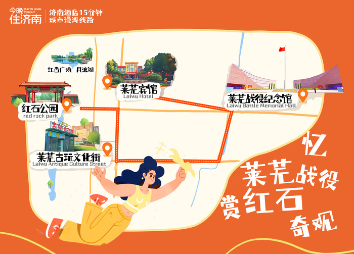 线路点位:莱芜宾馆→莱芜战役纪念馆→莱芜古玩文化街→红石公园(红杏广场、月波湖)→莱芜宾馆