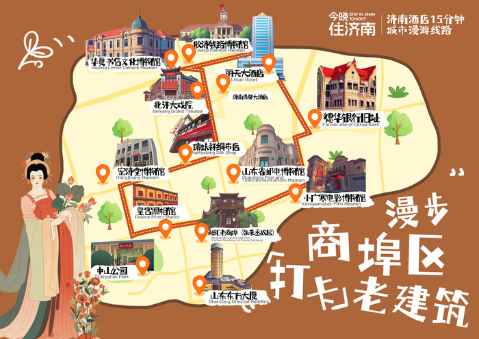 线路点位:山东丽天大酒店→胶济铁路博物馆→华夏书信文化博物馆→北洋大戏院→瑞蚨祥绸布店→宏济堂博物馆→中山公园→皇宫照相馆→融汇老商埠(张采丞故居)→小广寒电影博物馆→山东省邮电博物馆→德华银行旧址→山东丽天大酒店