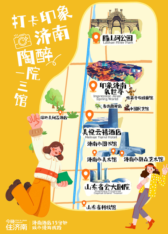 线路点位:美悦云禧酒店→印象济南•泉世界(帷幕开啦蜡像馆、中国民艺馆、非遗基地、鲁绣旗袍店)→腊山河公园→“一院三馆”(省会大剧院、市图书馆、美术馆、群众艺术馆)→山东省科技馆→美悦云禧酒店