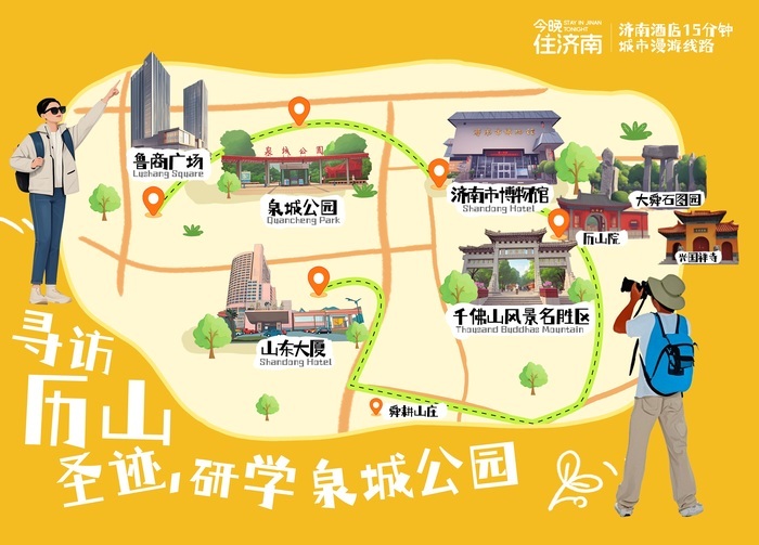 线路点位:山东大厦→千佛山风景名胜区(大舜石图园、历山院、兴国禅寺)→济南市博物馆→泉城公园→鲁商广场→山东大厦