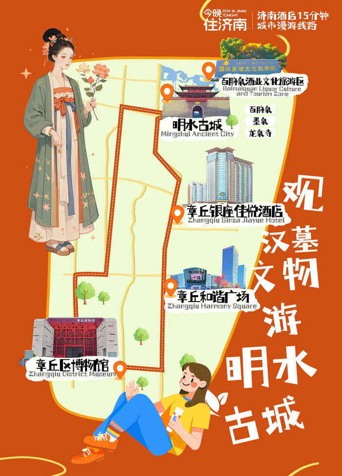 线路点位:章丘银座佳悦酒店→章丘区博物馆→明水古城(百脉泉、墨泉、龙泉寺、清照园)→百脉泉酒业文化旅游区→章丘和谐广场→章丘银座佳悦酒店