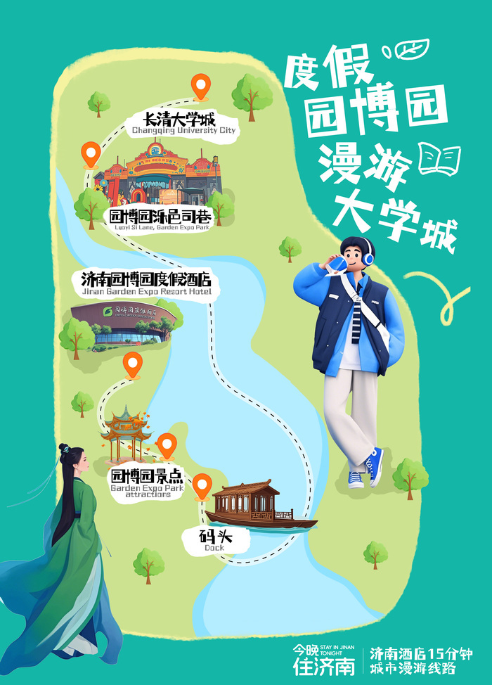 线路点位:济南园博园度假酒店→园博园内景点→船游长清湖→园博园泺邑司巷→长清区大学城→济南园博园度假酒店