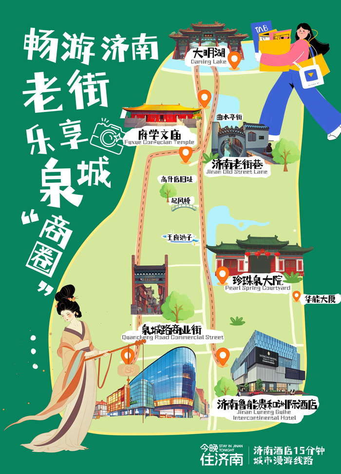 线路点位:济南鲁能贵和洲际酒店→珍珠泉大院→济南老街巷(打卡芙蓉街、起凤桥、王府池子、曲水亭街、高升店旧址)→泉城路商业街→济南鲁能贵和洲际酒店