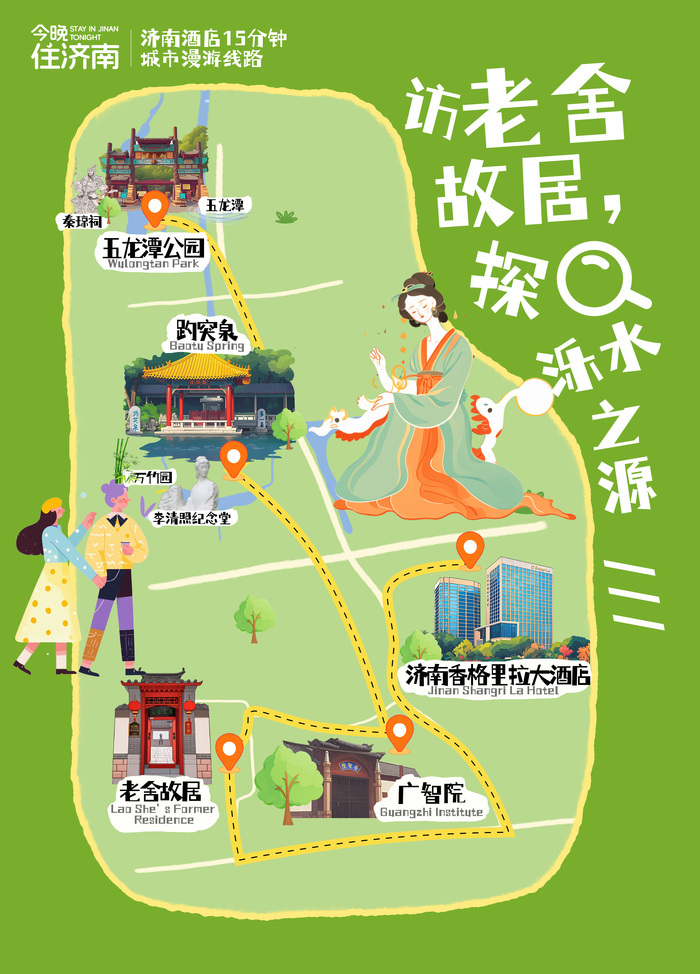 线路点位:济南香格里拉大酒店→老舍纪念馆→广智院→趵突泉公园(万竹园、趵突泉、李清照纪念堂)→五龙潭公园(五龙潭、秦琼祠、山东省委旧址)→济南香格里拉大酒店