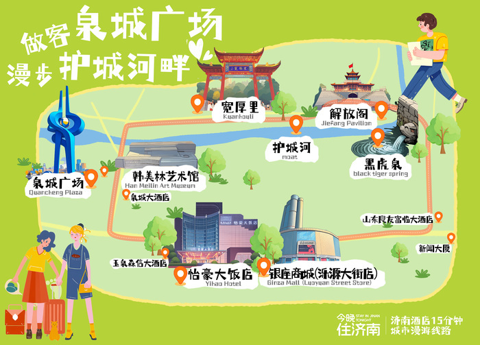线路点位:怡豪大饭店→泉城广场→韩美林艺术馆→宽厚里商业街→解放阁→护城河、黑虎泉→银座商城(泺源大街店)→怡豪大饭店