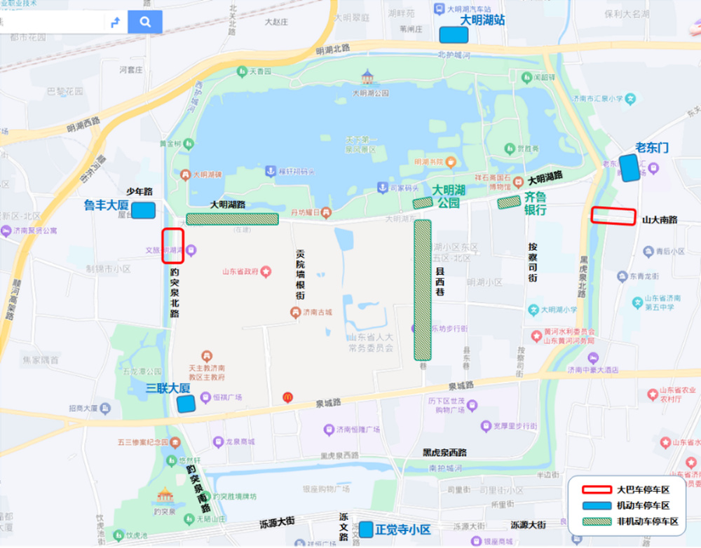 在趵突泉北路和山大南路设置大巴车集中停靠点并设置引导标识,满足外来游客团大巴车停放需求。