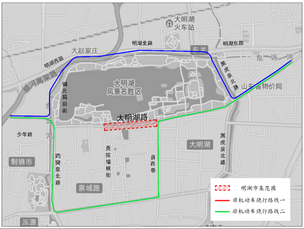 明湖市集举办期间,大明湖路(县西巷-贡院墙根街段)禁止通行非机动车,需通过明湖北路、泉城路等相邻道路绕行。
