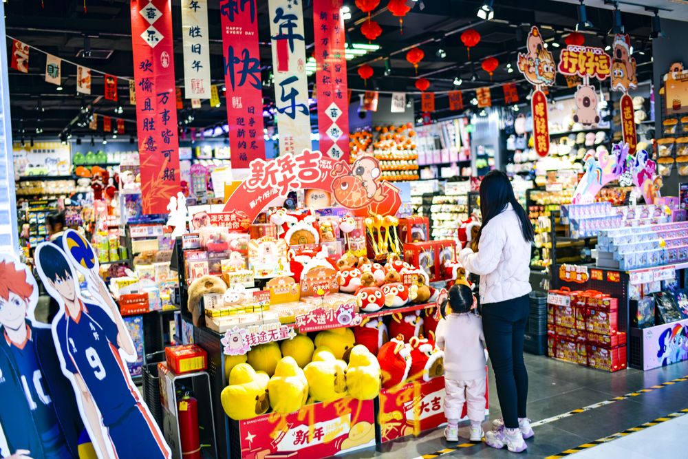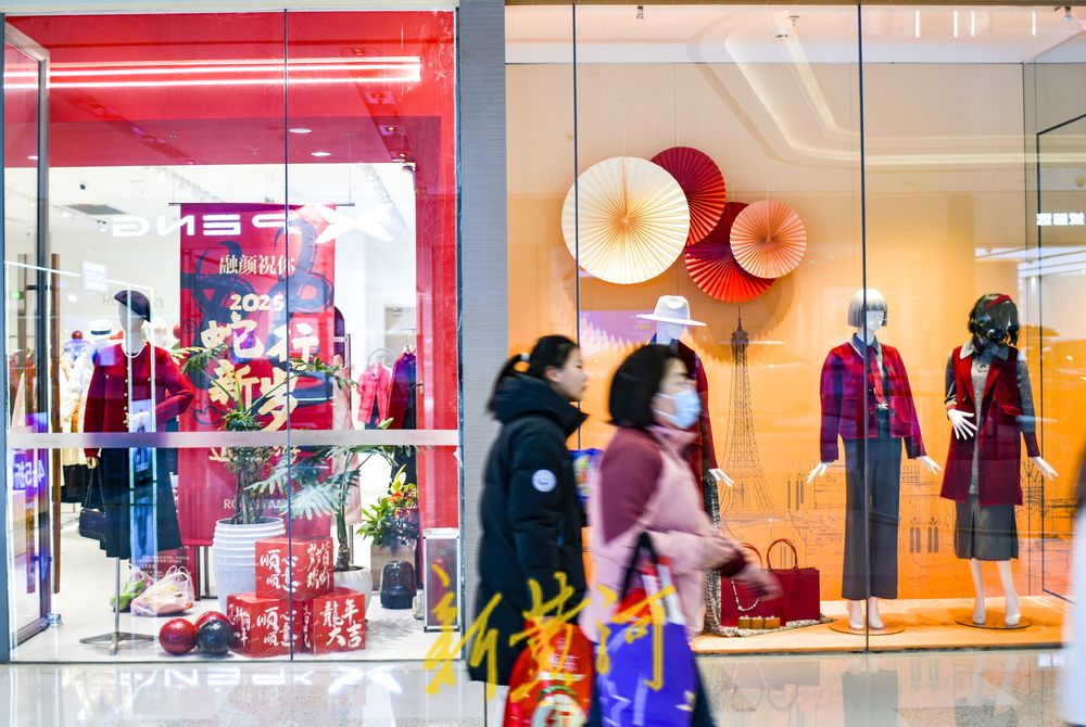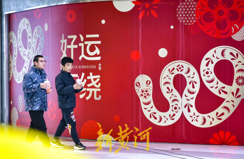 在二环东路高架附近一商业综合体内,商场的门头、橱窗、走廊等显眼位置被精心装扮。以蛇年为主题的各种装饰物,如灵动的蛇形图案、金色的蛇年福字等,与商场内的各种商品交相辉映,让人眼前一亮,为市民营造一个更加喜庆、祥和、热闹的购物环境。